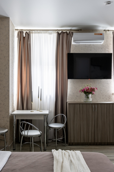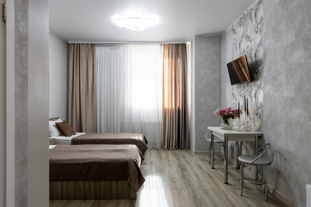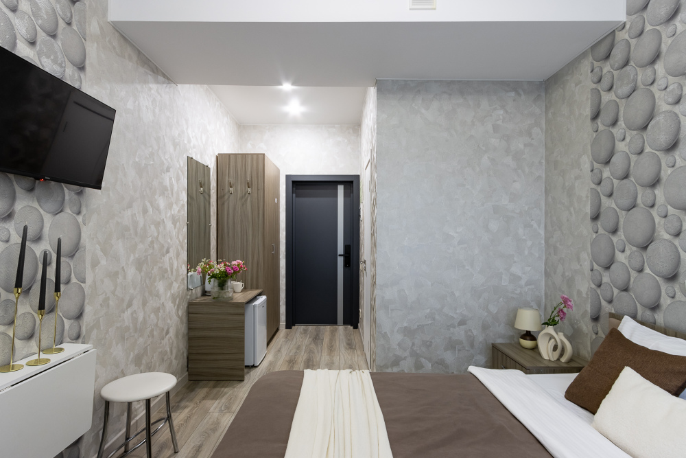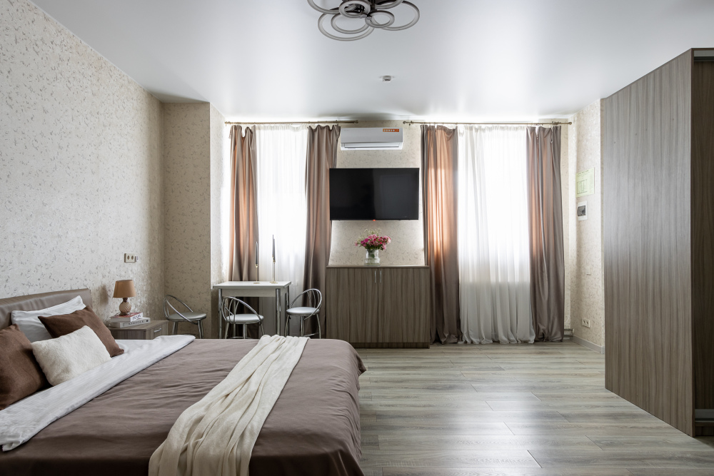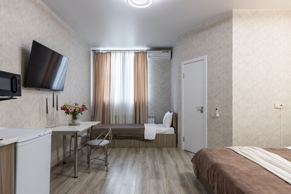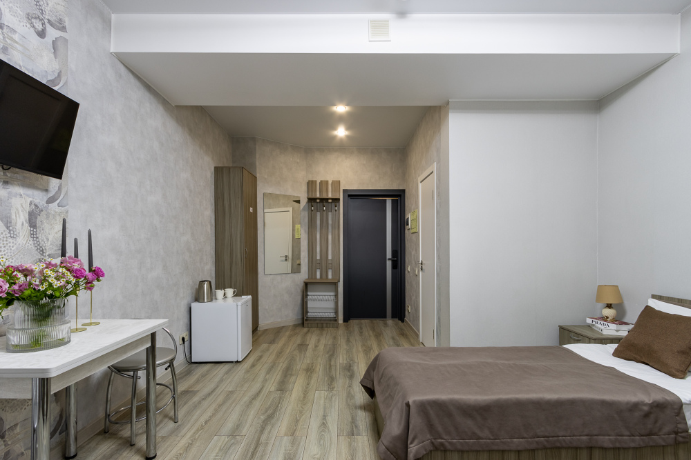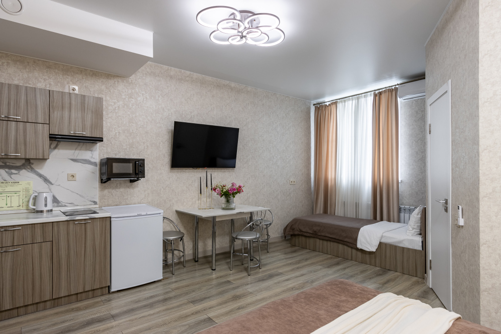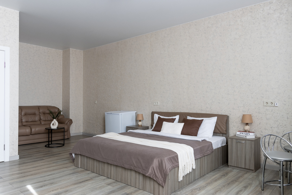 Гости могут забронировать номера категорий Улучшенный, Семейный и Люкс. В каждом из них есть все необходимое для комфортного проживания: кровать, телевизор, кондиционер, чайник, холодильник, собственная ванная комната. В номерах Семейный и Люкс - собственная кухня со всей необходимой техникой и посудой.