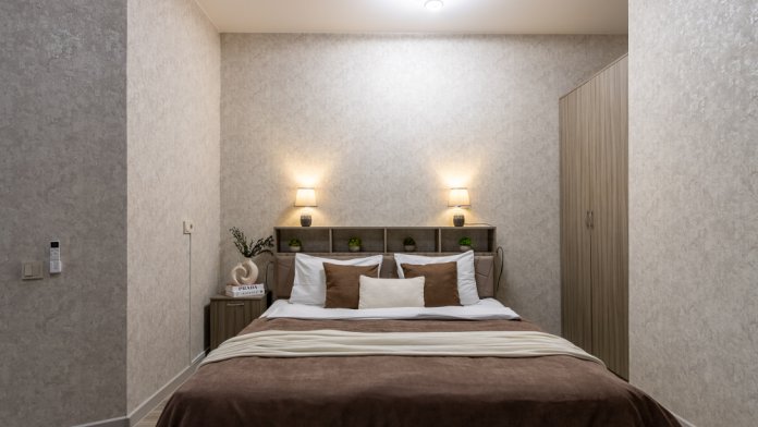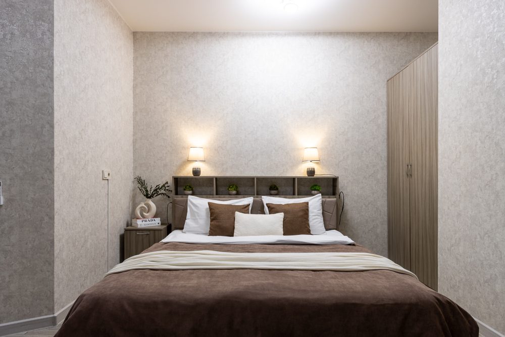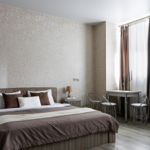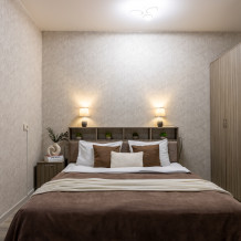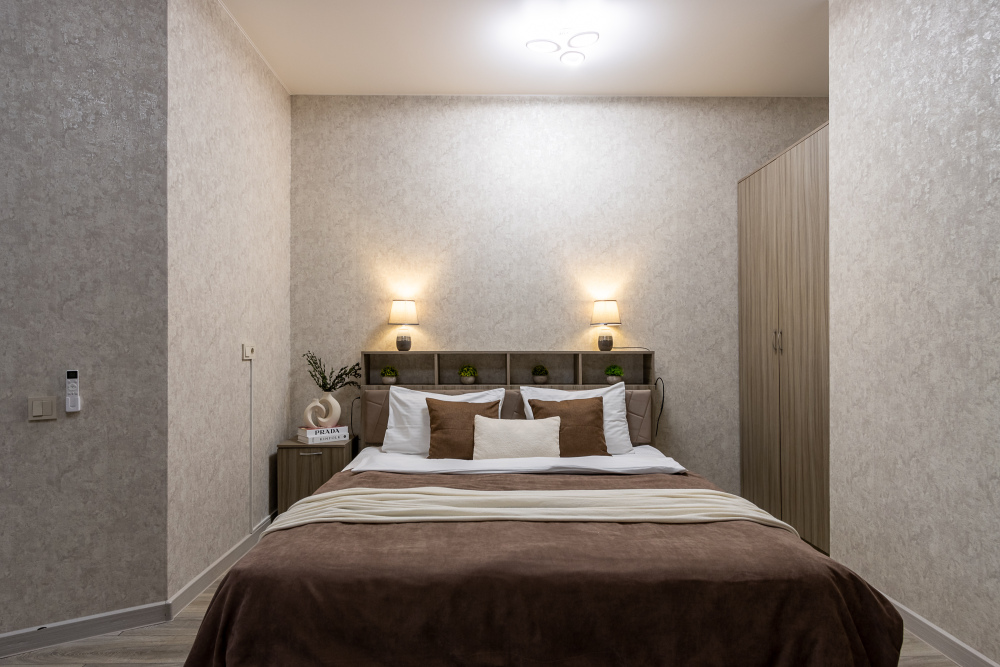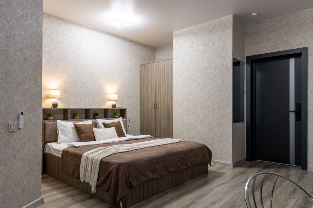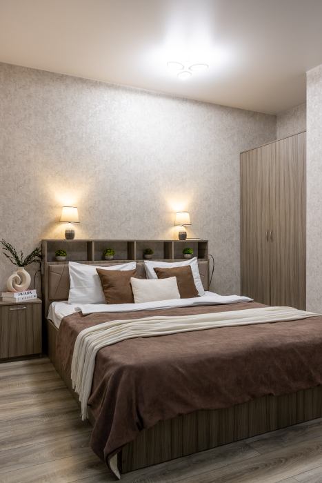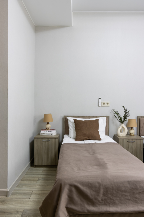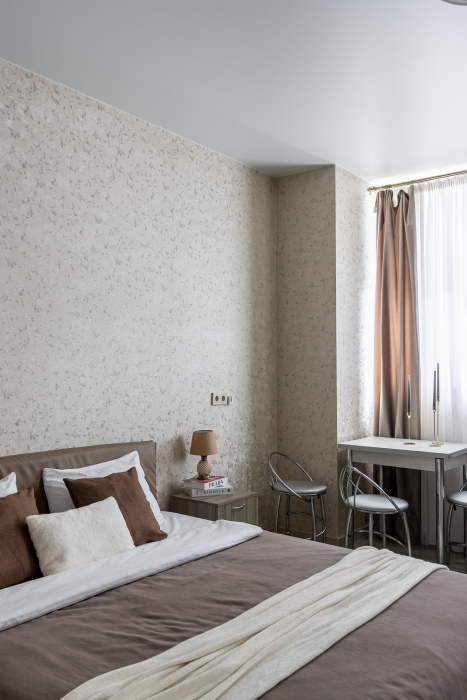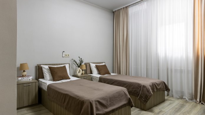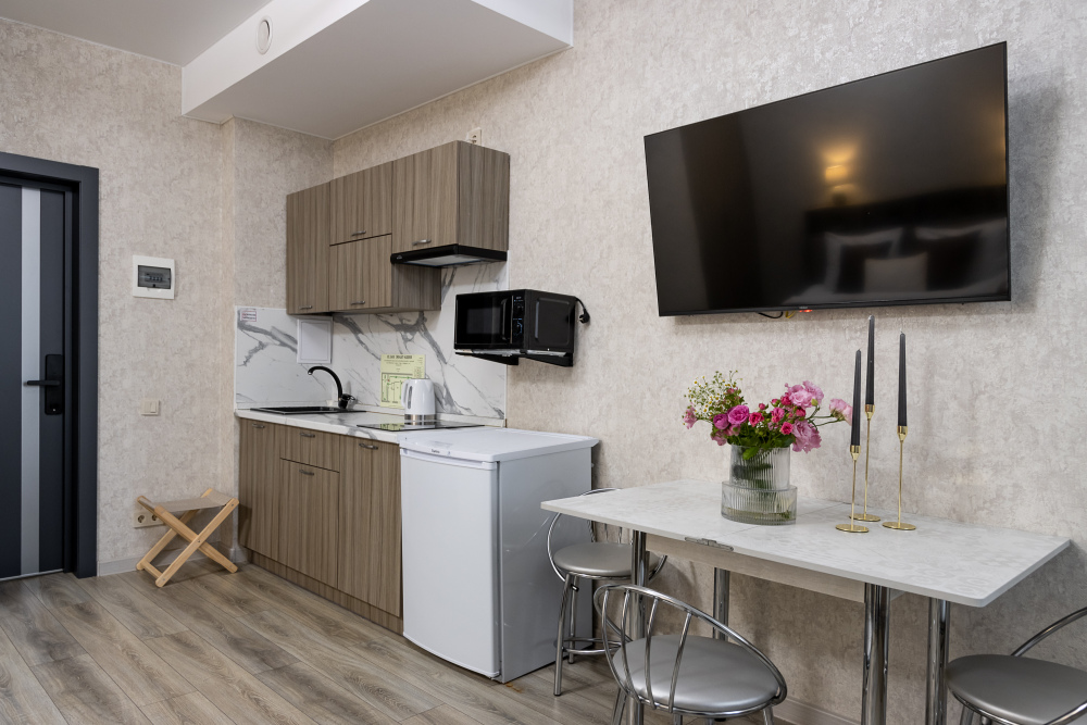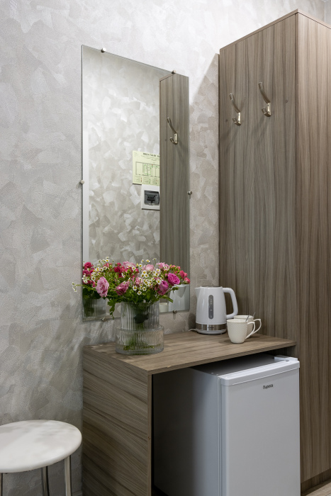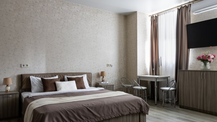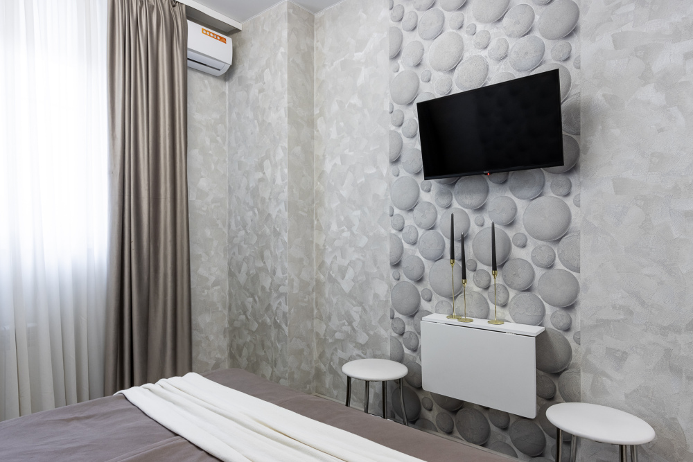 Гости могут забронировать номера категорий Улучшенный, Семейный и Люкс. В каждом из них есть все необходимое для комфортного проживания: кровать, телевизор, кондиционер, чайник, холодильник, собственная ванная комната. В номерах Семейный и Люкс - собственная кухня со всей необходимой техникой и посудой.