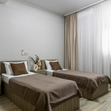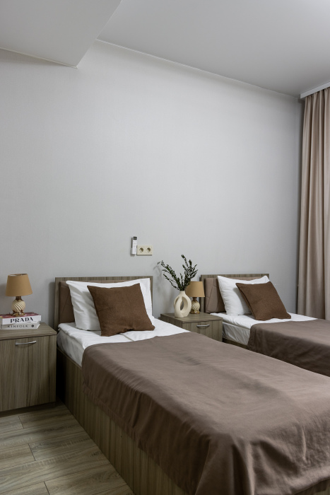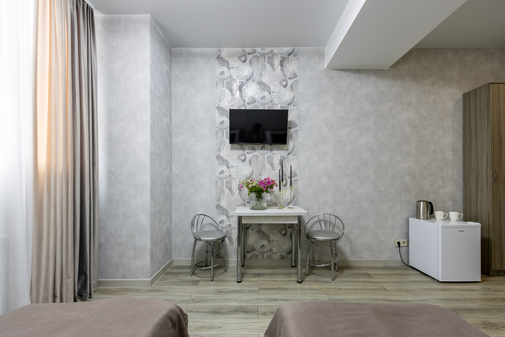 В номере: одна двуспальная или две односпальные кровати, холодильник, телевизор, чайник, кондиционер, журнальный столик и ванная комната.