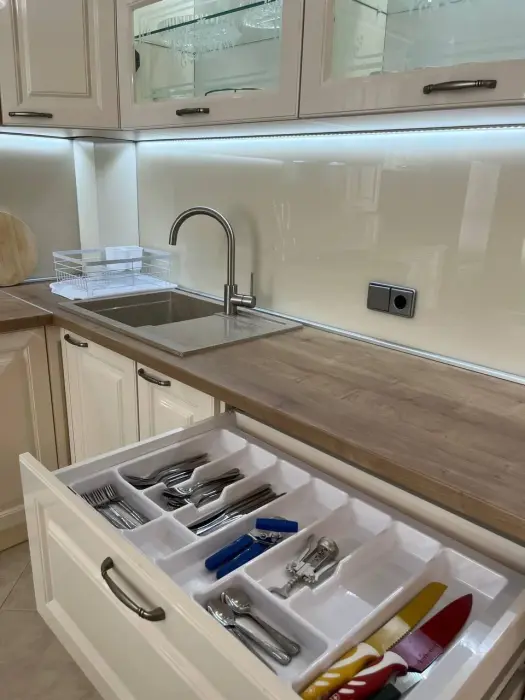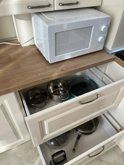 - посуда: стoловыe принадлeжности, чашки, салатницы, глубокие и пирожковые тарелки, тарелки для 2-х блюд, стаканы, бокалы на 6 персон, доски разделочные, ножи, набор кухонных принадлежностей, кастрюли, сковородки;