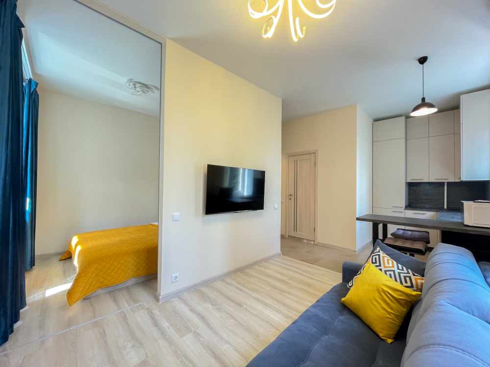 Просторная евро 2-комнатная квартира (спальня и кухня-гостиная) с новым дизайнерским ремонтом.