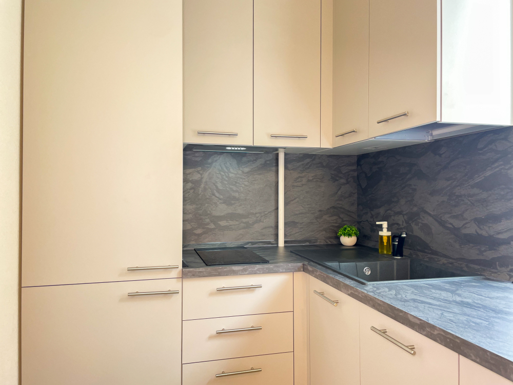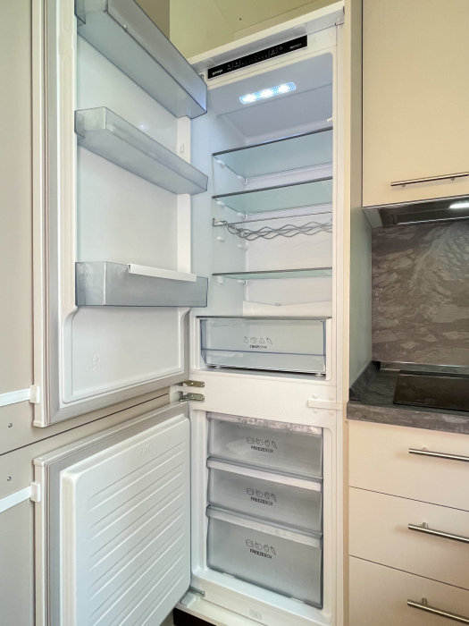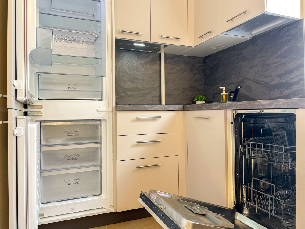 Полностью оборудованная кухня: индукционная плита, большой встроенный холодильник с морозильной камерой, посудомоечная машина, СВЧ, электрический чайник и вся необходимая посуда, удобная обеденная зона.