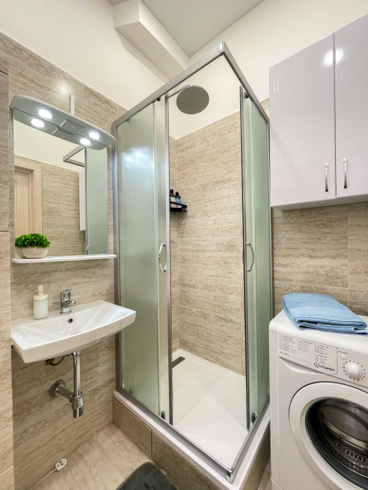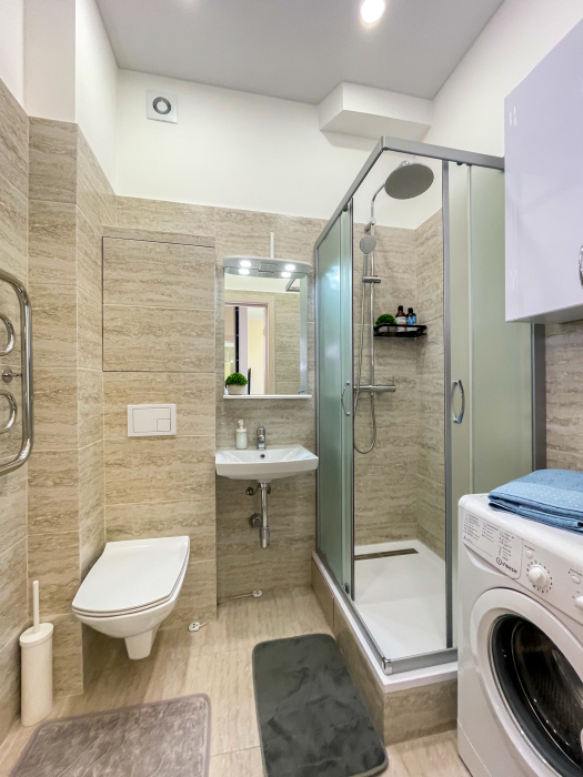 Ванная комната: душевая кабина, туалет, раковина, стиральная машина, сушилка, утюг и гладильная доска, полотенца, шампунь, гель для душа для каждого гостя.