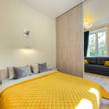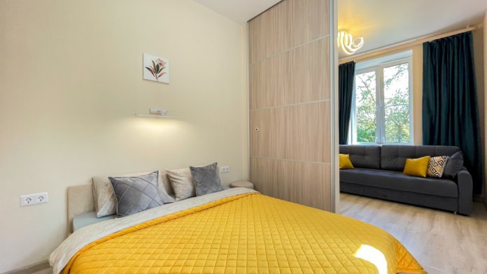 Функциональная спальня: просторная и очень удобная двуспальная кровать (160 см) с удобным матрасом, свежим постельным бельём, одеялом и подушками, современный шкаф-купе для удобного хранения вещей, шторы блэкаут на окнах для комфортного сна.