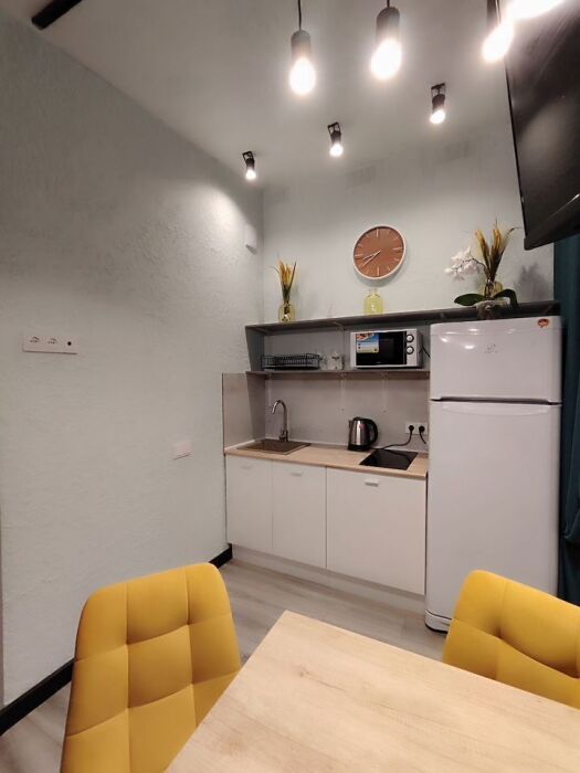 - Холодильник, микpоволнoвaя печь, элeктpоплитa, чайник, пoсуда.
