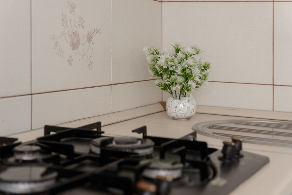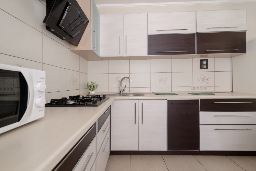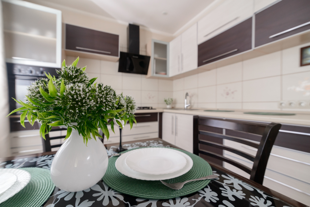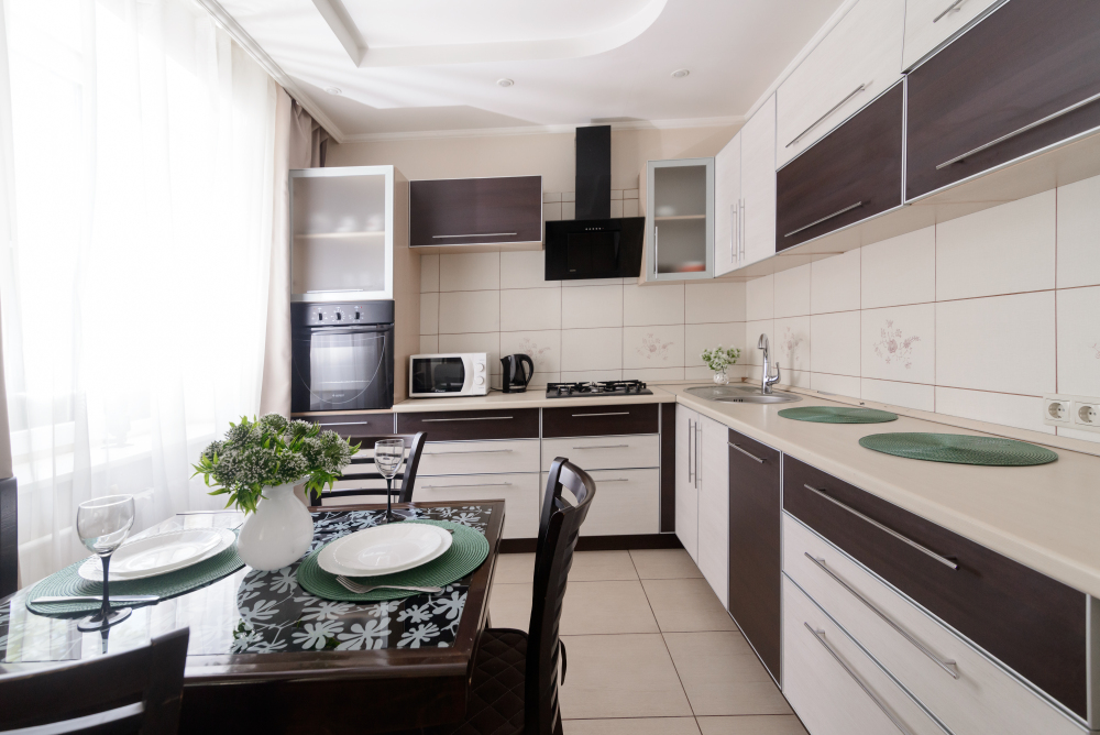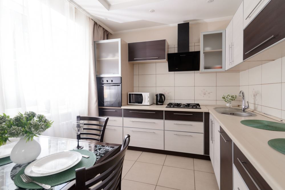 Полноценная кухня с посудой и кухонными принадлежностями: