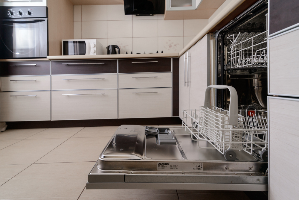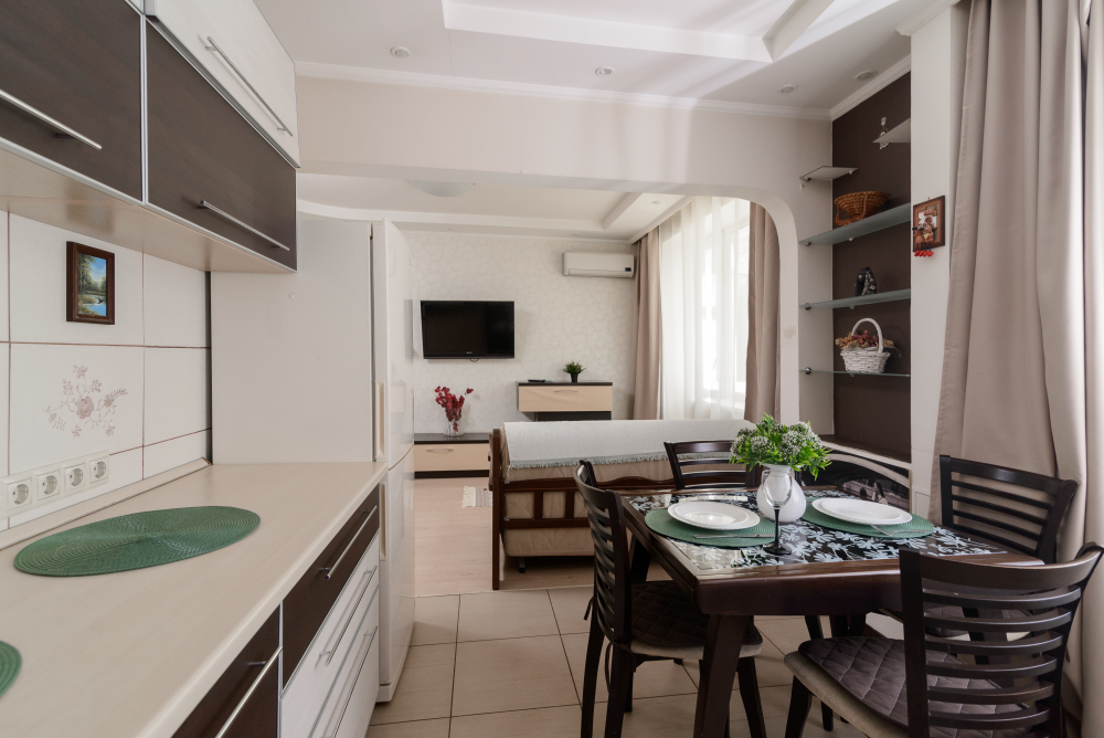 Стильное пространство с кондиционером, посудомоечной машиной и полной инфраструктурой.