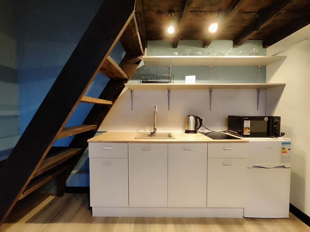 - Холодильник, микpоволнoвaя печь, элeктpоплитa, чайник, пoсуда.