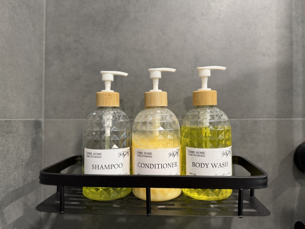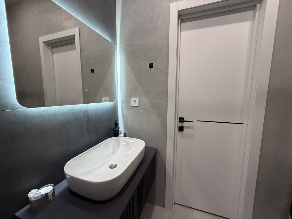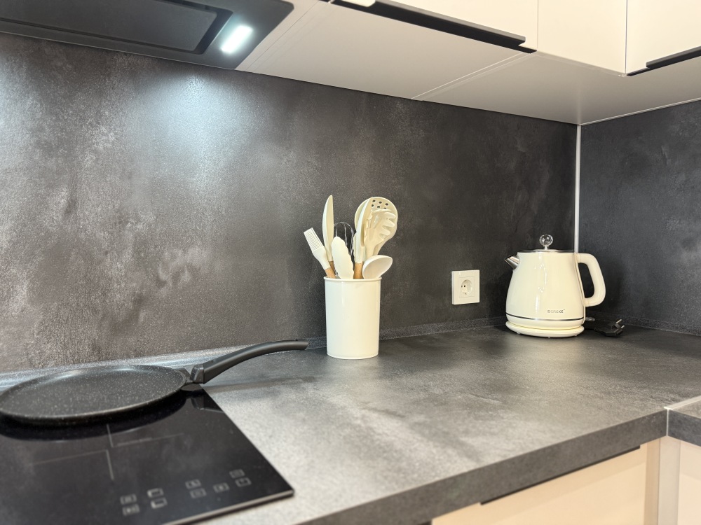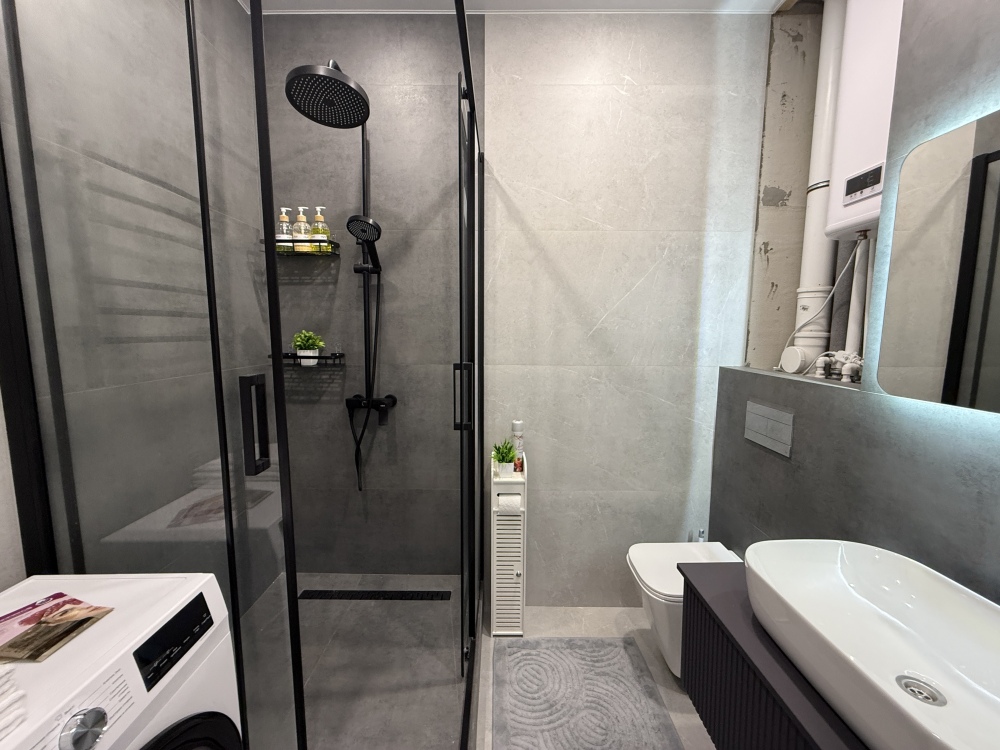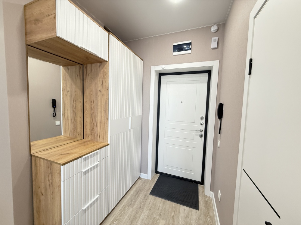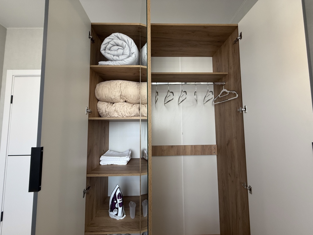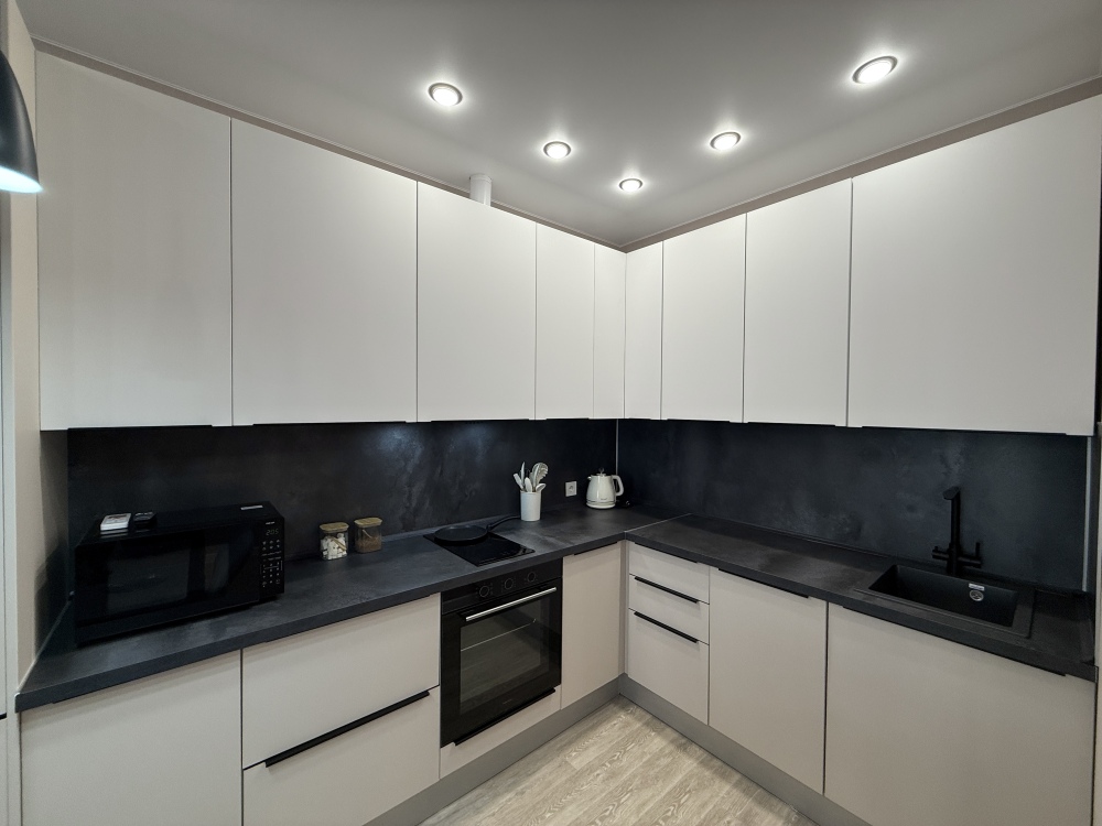 - Современная бытовая техника: варочная панель, духовой шкаф, посудомоечная машина, двухкамерный холодильник, вытяжка, электрочайник, фен, утюг, СВЧ, стиральная машина.