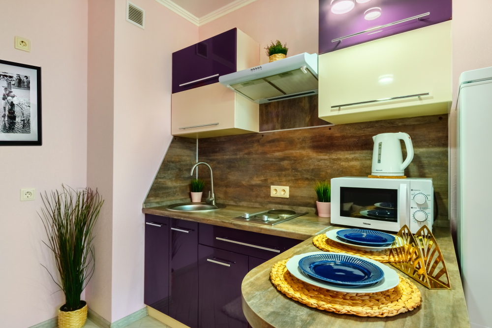 - современная кухня с обеденным столом, кухонным гарнитуром, электроплитой, холодильником, микроволновой печью, электрочайником и всей необходимой посудой;