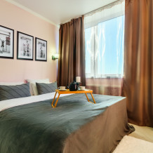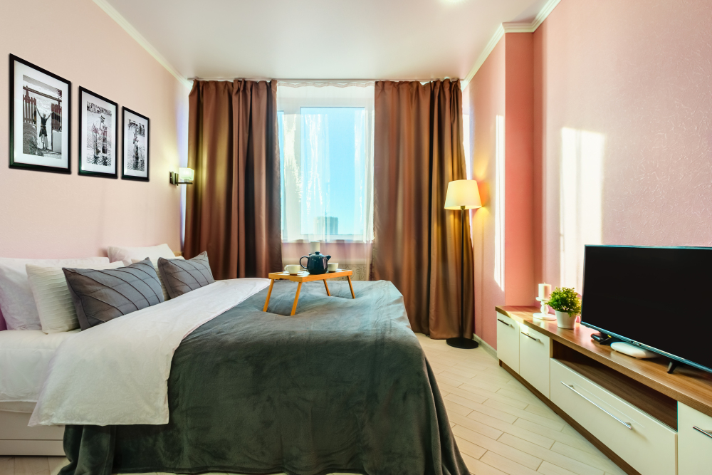- просторная комната с большой двуспальной кроватью, уютным диваном, телевизором и стильным журнальным столиком;