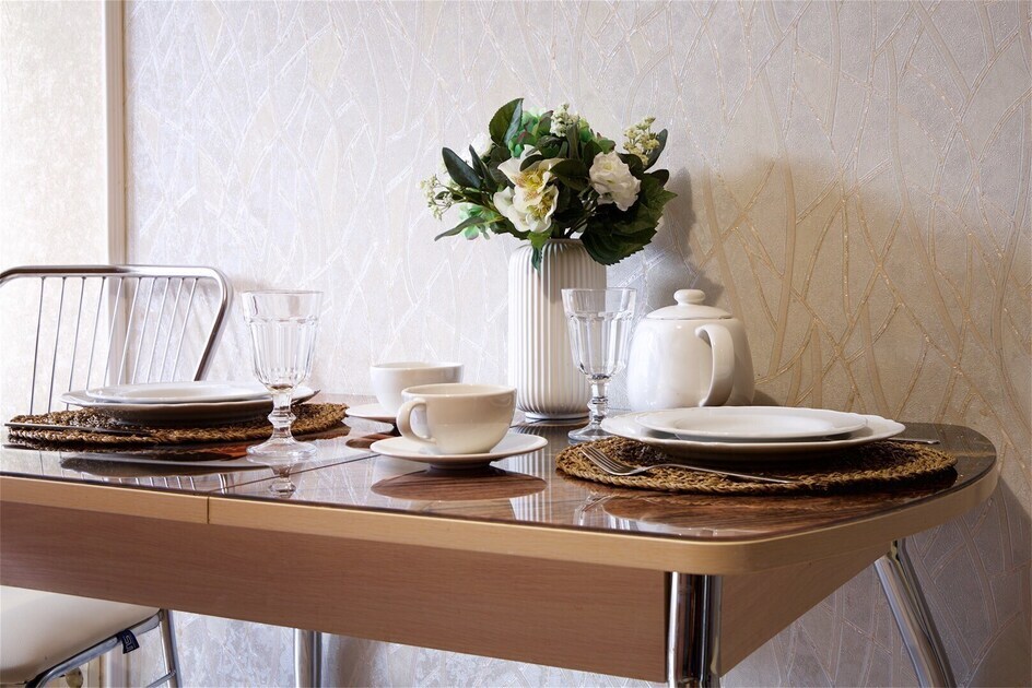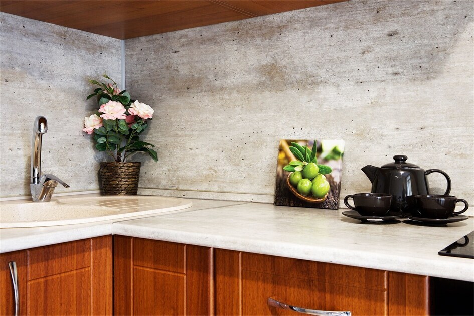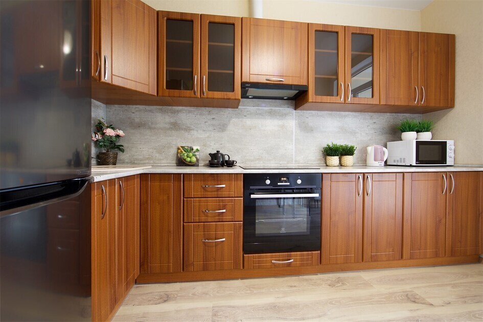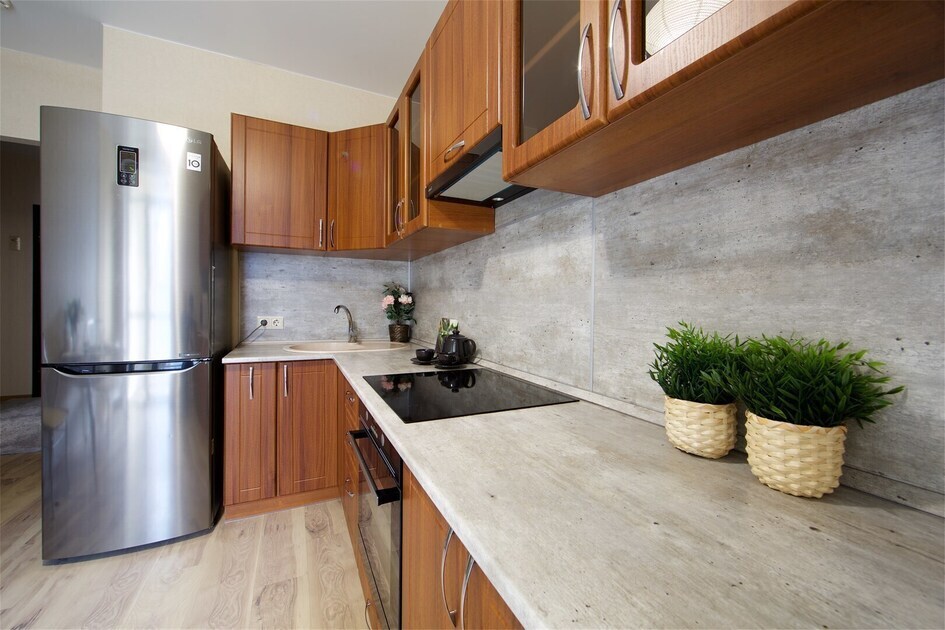 - современная кухня с обеденным столом, кухонным гарнитуром, электроплитой, холодильником, микроволновой печью, электрочайником и всей необходимой посудой;