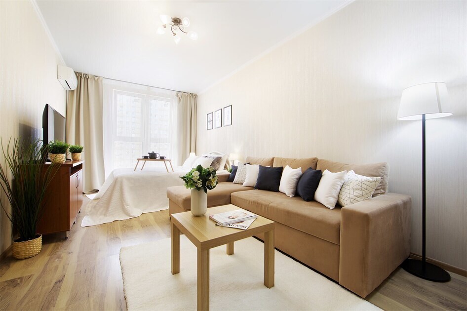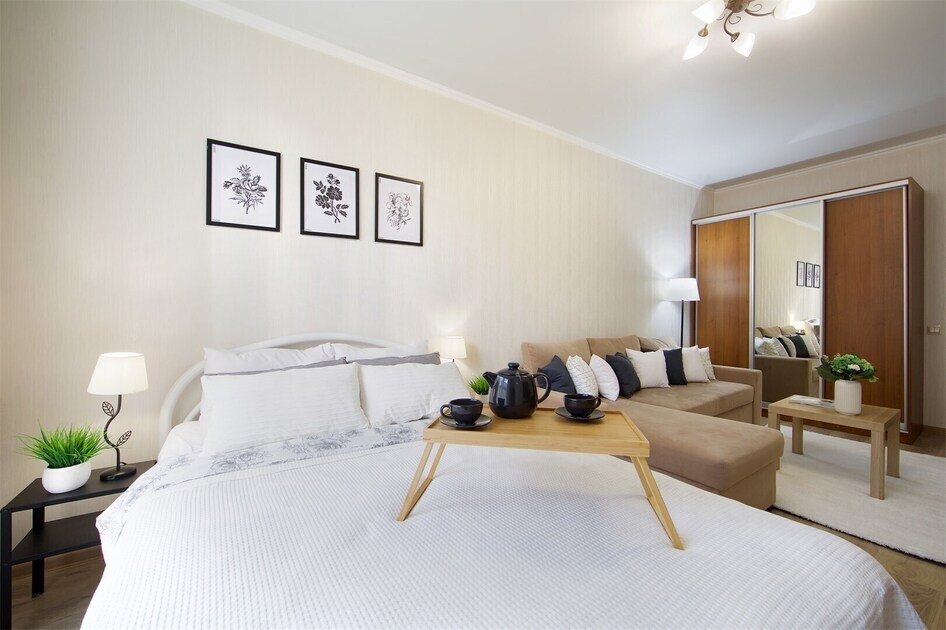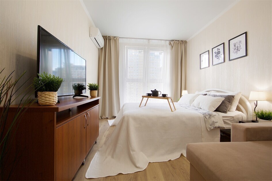 - просторная комната с большой двуспальной кроватью, уютным диваном, телевизором и стильным журнальным столиком;
