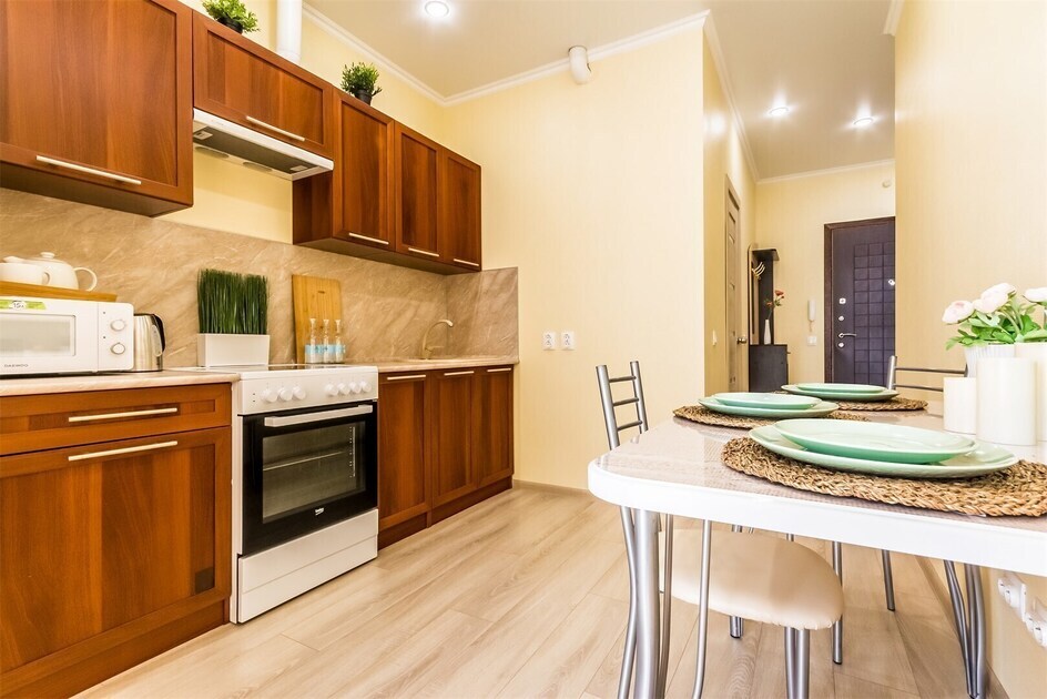- современная кухня с обеденным столом, кухонным гарнитуром, электроплитой, холодильником, микроволновой печью, электрочайником и всей необходимой посудой;