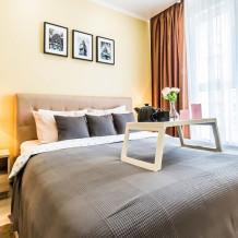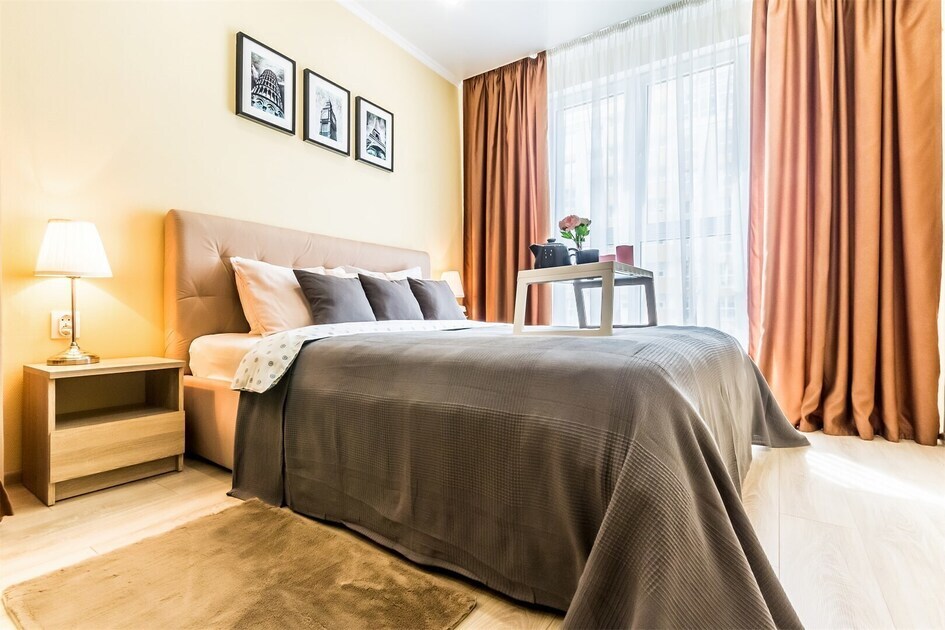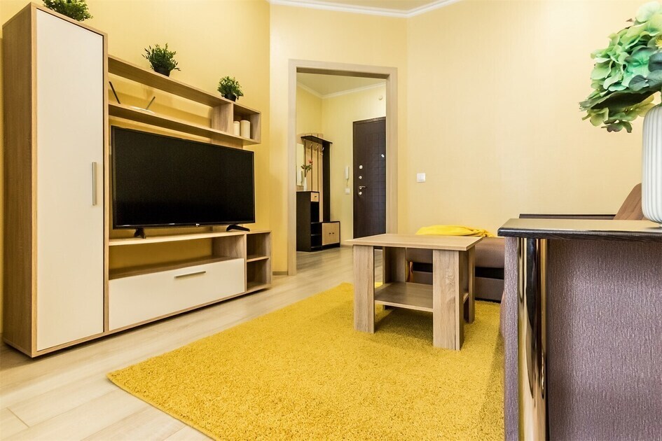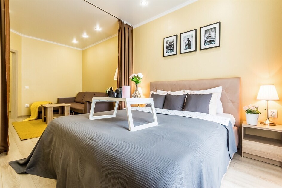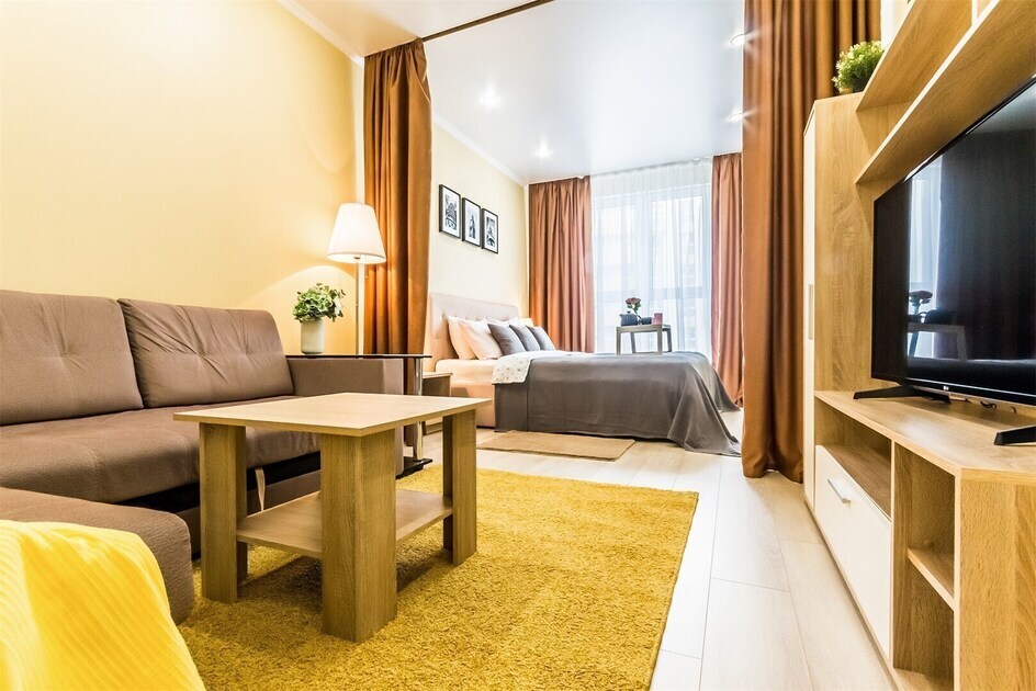 - просторная комната с большой двуспальной кроватью, уютным диваном, телевизором и стильным журнальным столиком;