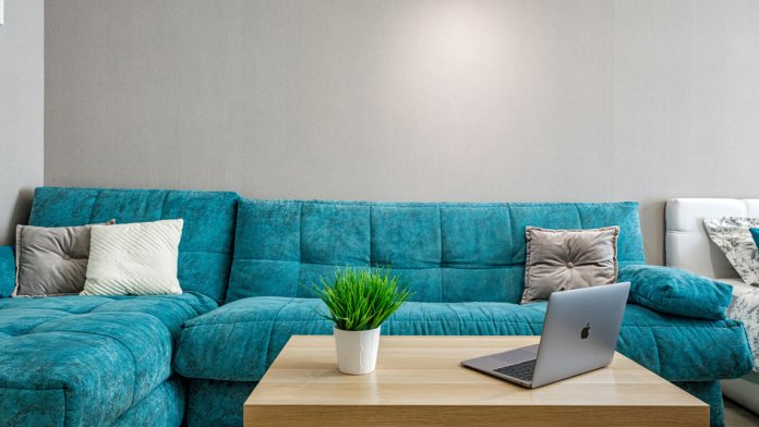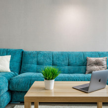 - просторная комната с большой двуспальной кроватью, уютным диваном, телевизором и стильным журнальным столиком;