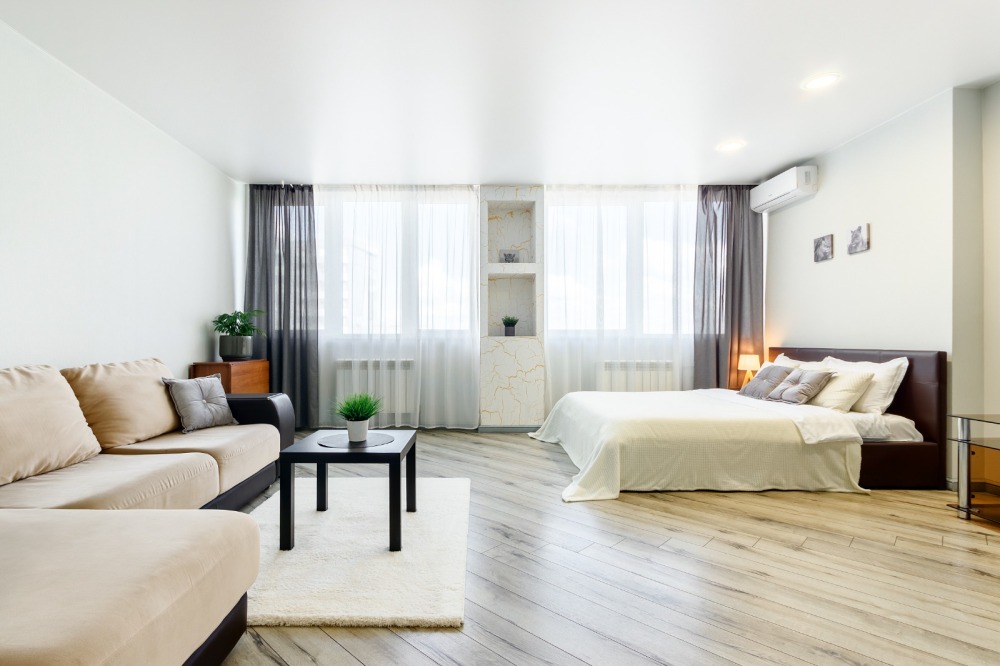 - просторная комната с большой двуспальной кроватью, уютным диваном, телевизором и стильным журнальным столиком;