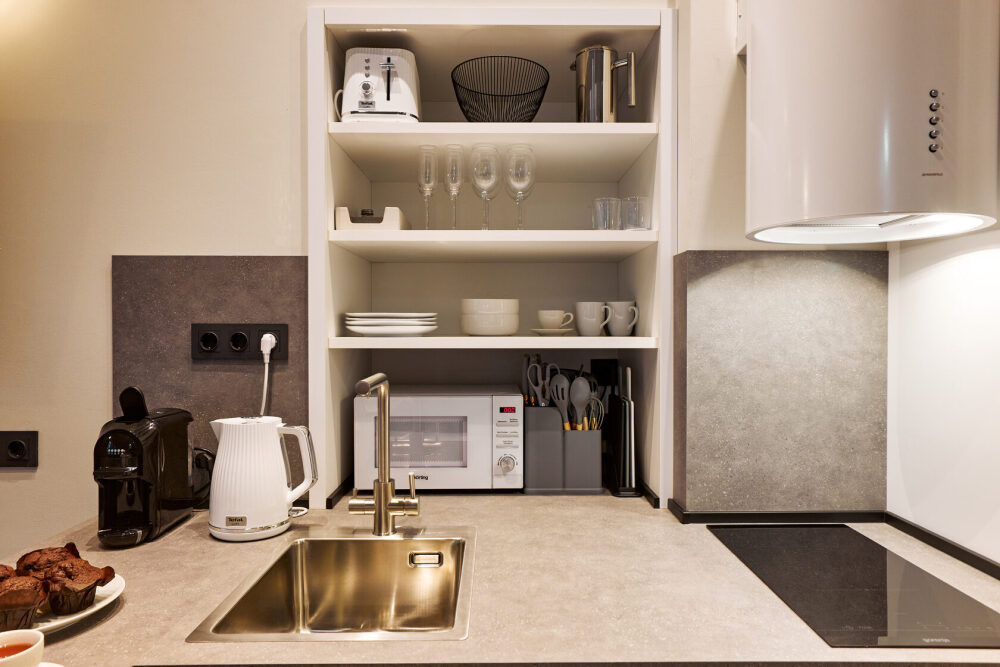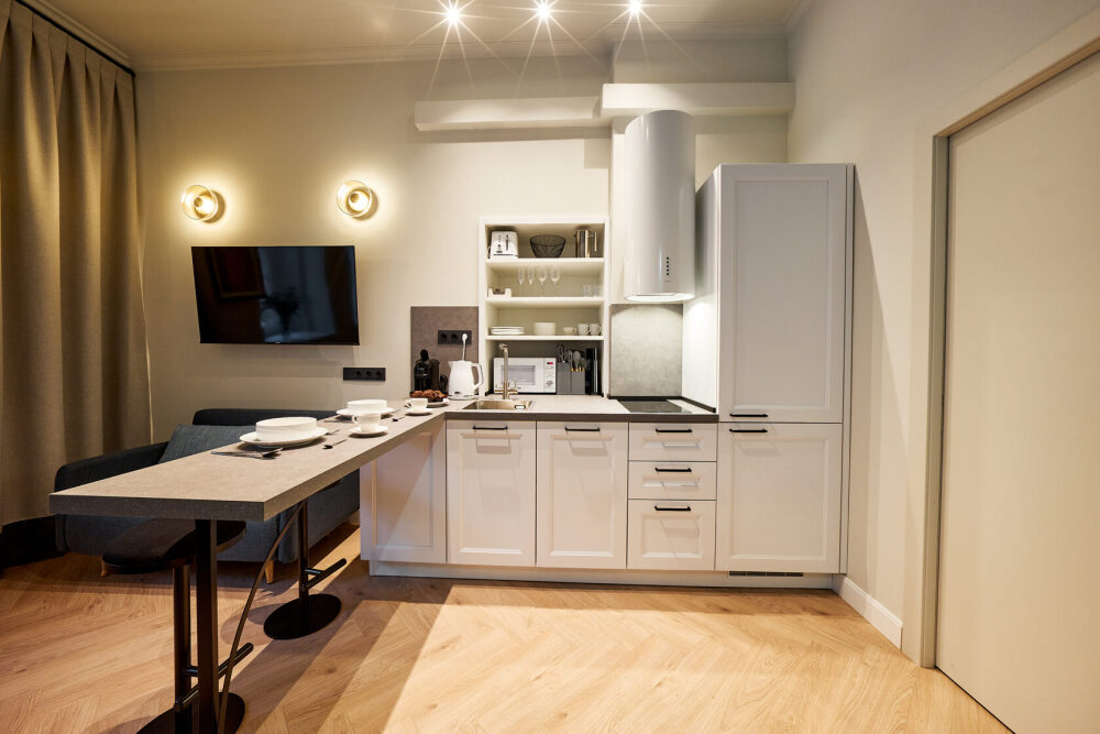 - Полностью оснащенная кухня (посудомоечная машина, духовой шкаф, СВЧ печь, варочная панель);