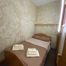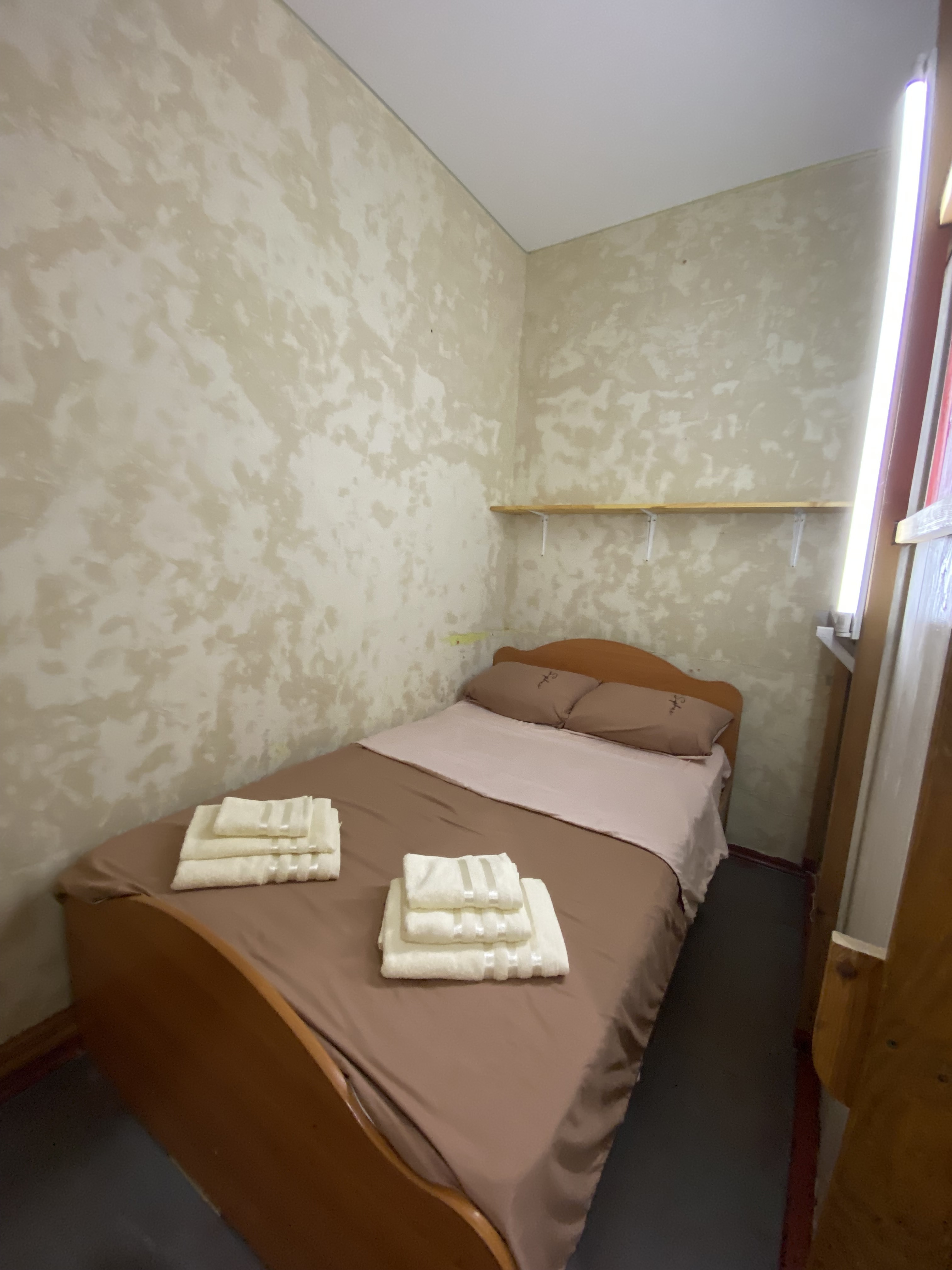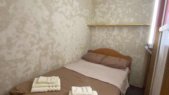Квартира разделена на 2 комнаты, в комнате без окон стоит двухспальная кровать и шкаф для вещей, в большой комнате двухспальный кровать с матрасом и раздвижной диван-кровать, комнаты упакованы до 6 спальных мест.