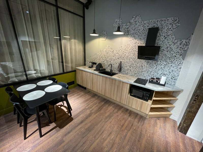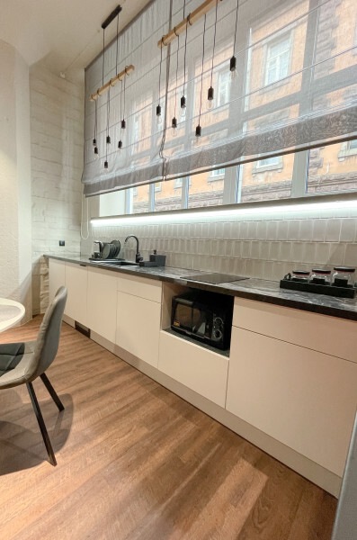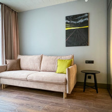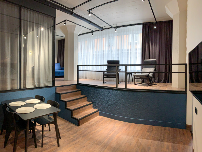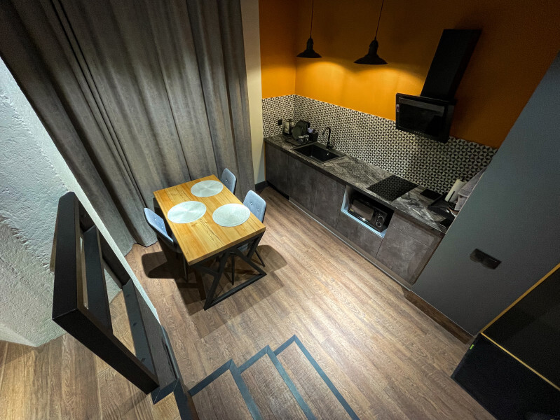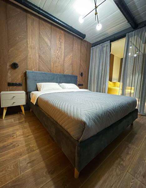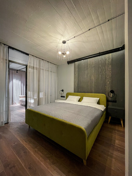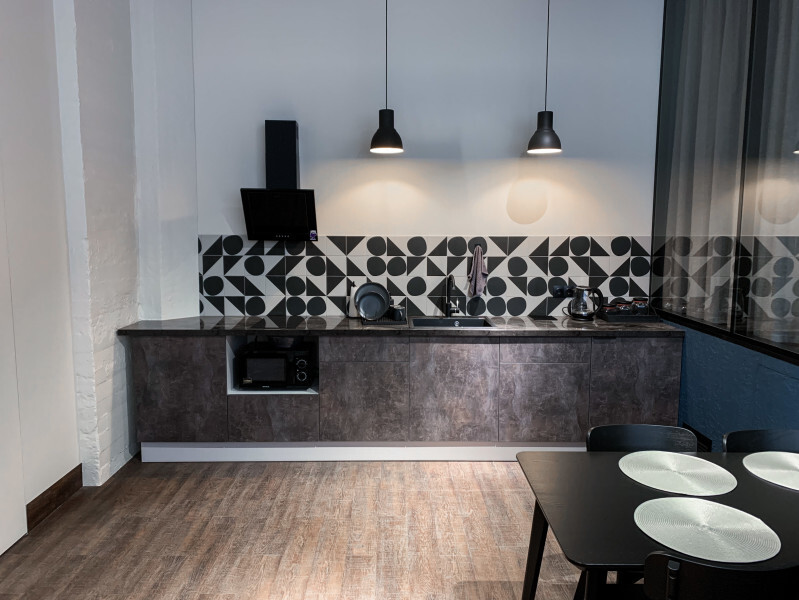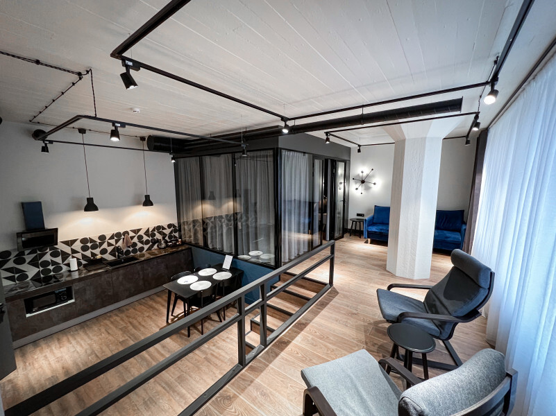 Квартиры с дизайнерским ремонтом в стиле лофт. Квартиры рассчитаны от 2 до 4 человек, оборудованы кухней со всей необходимой техникой. Собственный санузел с душевой кабиной. Апартаменты расположены на 1 этаже. В каждом номере есть все необходимое для комфортного отдыха: большая кухня, оборудованная всем необходимым, чай и кофе, в ванных – фен и полотенца.