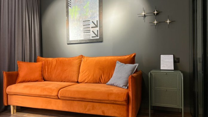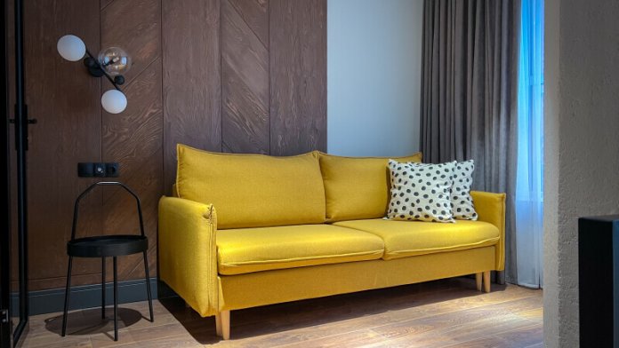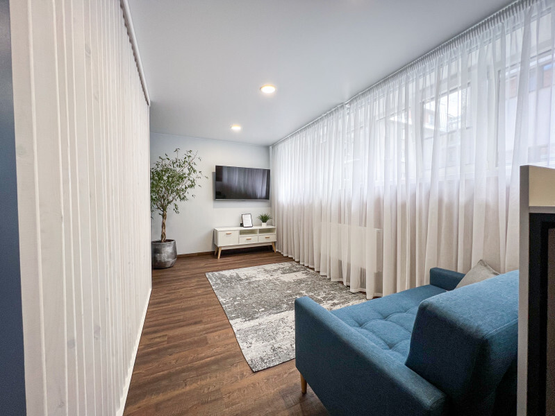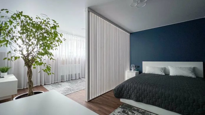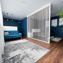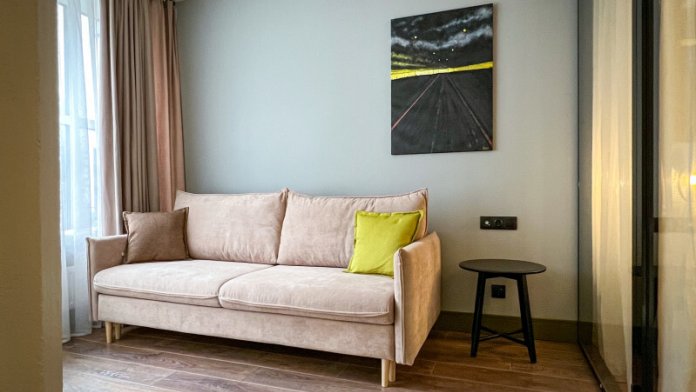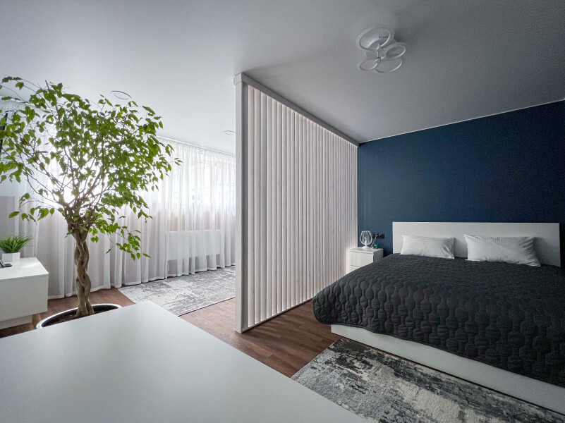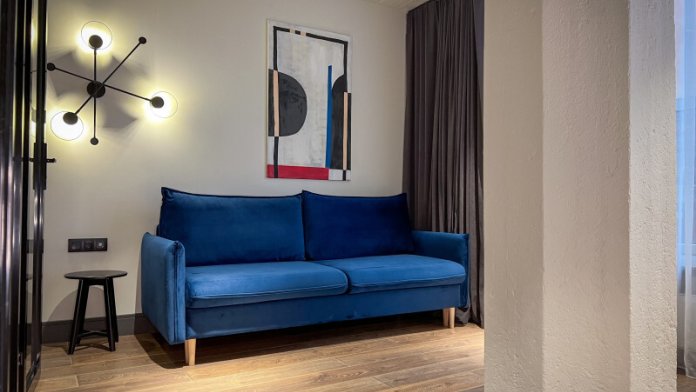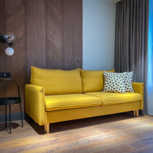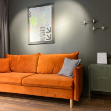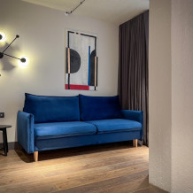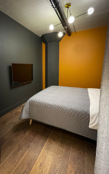 Самый маленький из наших дизайнерских номеров, но зато он самый уютный. Главный его плюс – телевизор находится прямо в спальне. Также в номере есть кухня, ванная комната и раскладной диван, который можно использовать как дополнительное спальное место еще для одного человека.