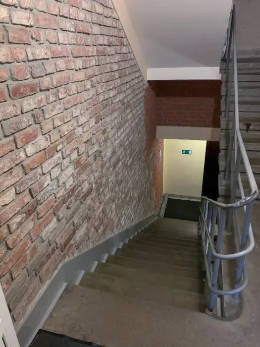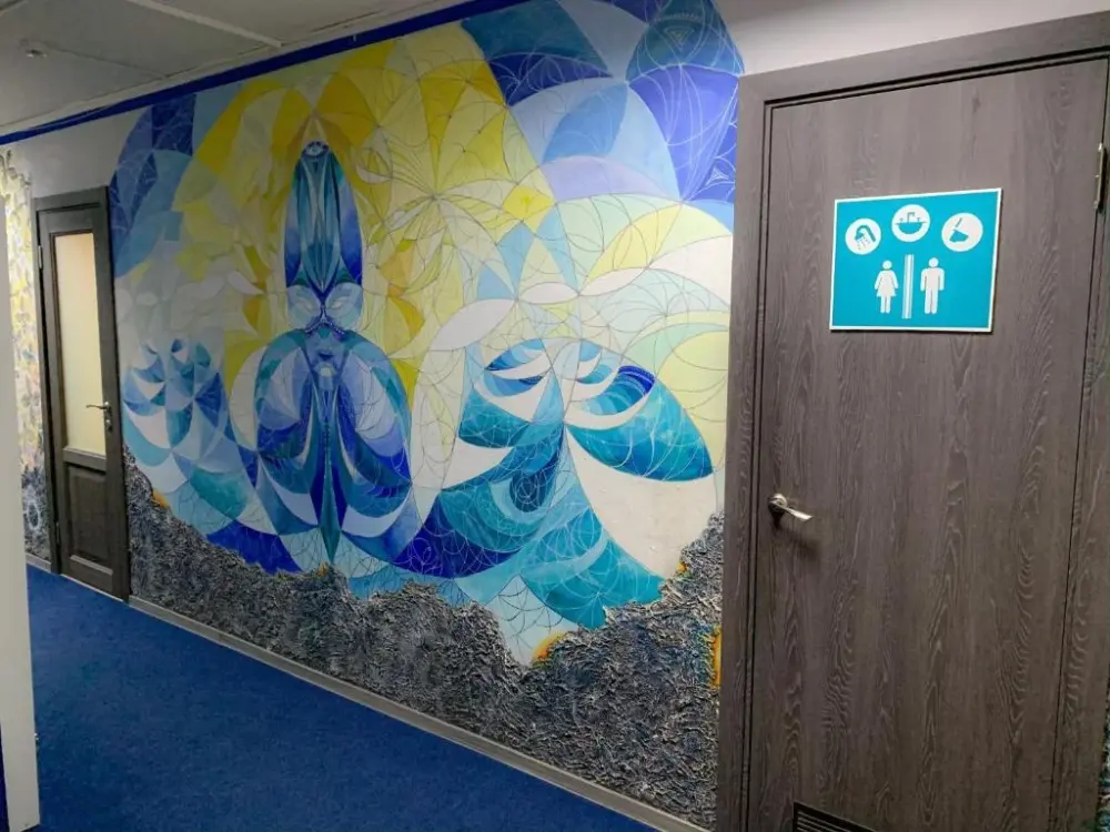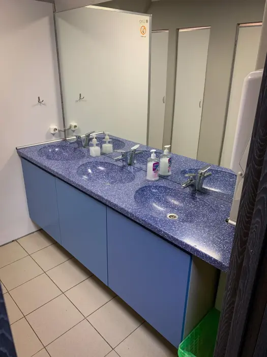Удобства на этаже. Общий санузел с несколькими туалетными кабинами и отдельными душевыми.