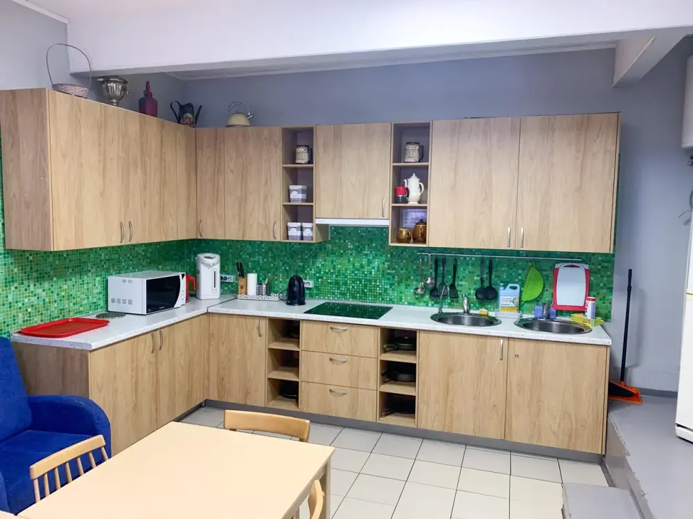 Общая кухня где Вы найдете все необходимое для приготовления пищи и сервировки стола. Холодильник, СВЧ, варочная панель, электрический чайник. Чай и сахар бесплатно для всех гостей.