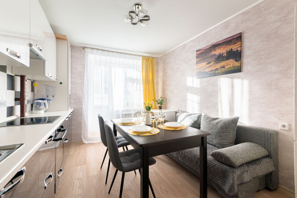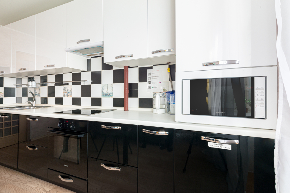 – Полностью оборудованная кухня (холодильник, электрическая варочная панель, духовой шкаф, вытяжка, микроволновая печь, электрический чайник, фильтр для питьевой воды).