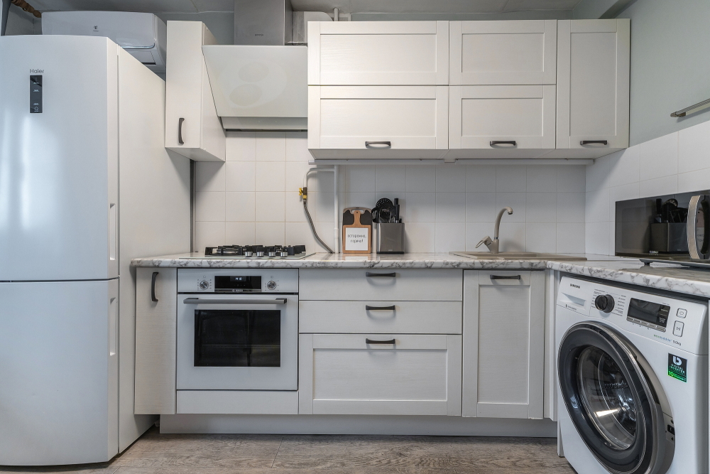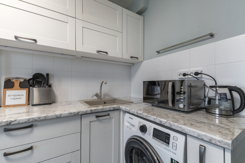 Вся необходимая техника: кондиционер, стиральная машина, холодильник, СВЧ-печь, чайник.