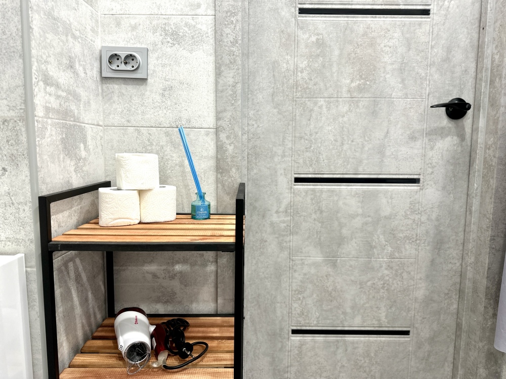 - Современная бытовая техника: электрическая плита, двухкамерный холодильник, электрочайник, СВЧ, фен, утюг, стиральная машина.