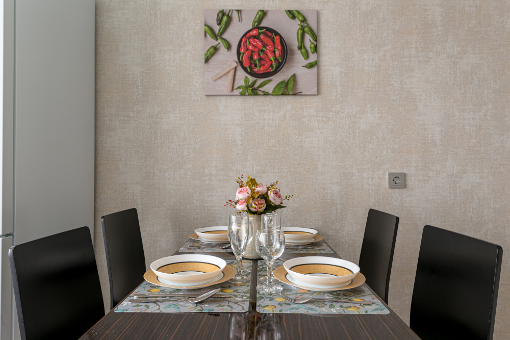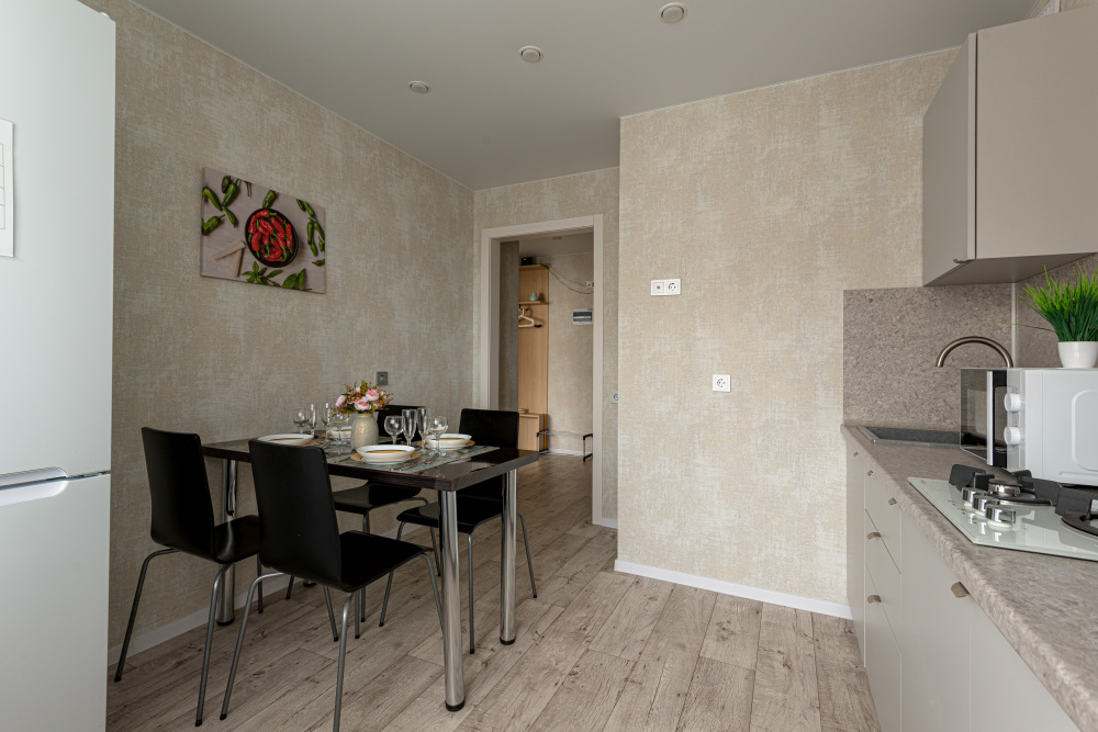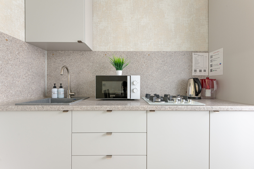 – Полностью оборудованная кухня (холодильник, газовая варочная панель, микроволновая печь, электрический чайник, фильтр для питьевой воды)