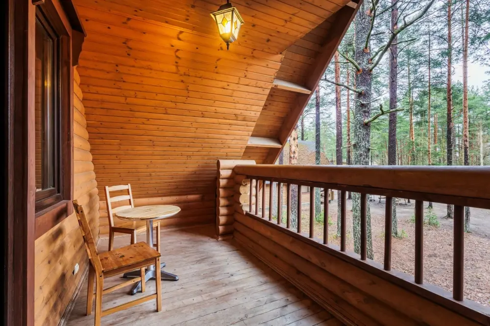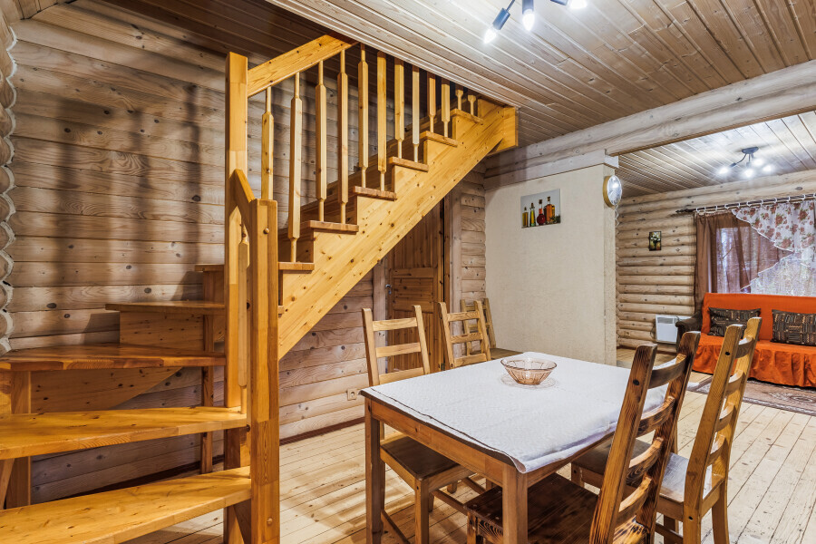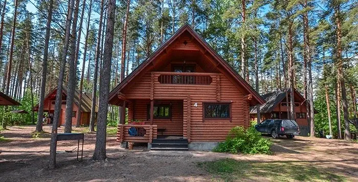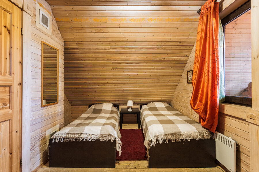 - Шесть деревянных коттеджей оборудованных современной бытовой техникой, компактной сауной на четырех человек, уютной мебелью и дровяным камином. Они полностью идентичны.