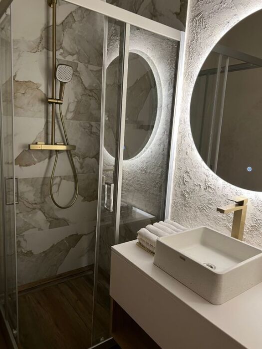 На территории расположено 3 домика вместимостью 3, 6, и 8 человек. В каждом доме дизайнерский интерьер, удобные спальные места, кухня оборудована всем необходимым для приготовления пищи, санузел с душевой кабиной.