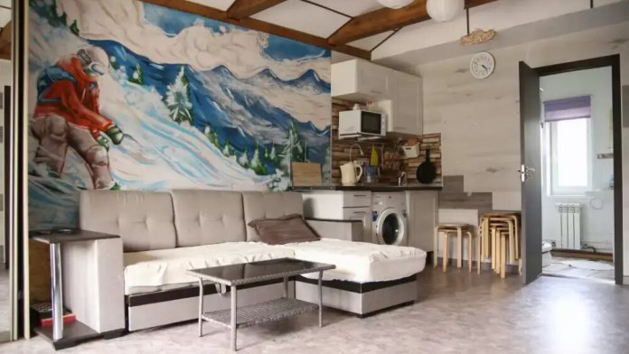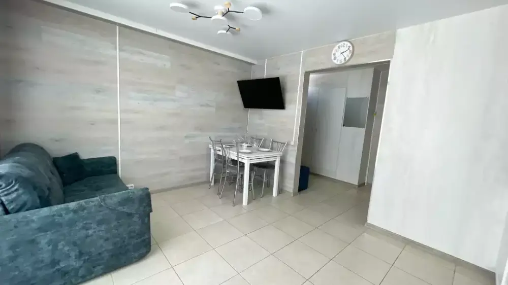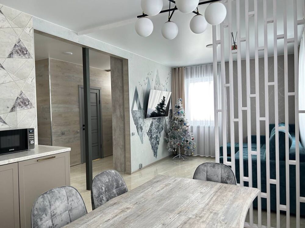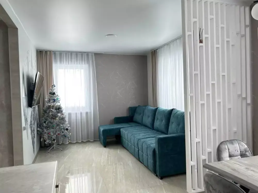 Большая гостиная совмещенная с кухней. Широкий раскладной диван, телевизор.