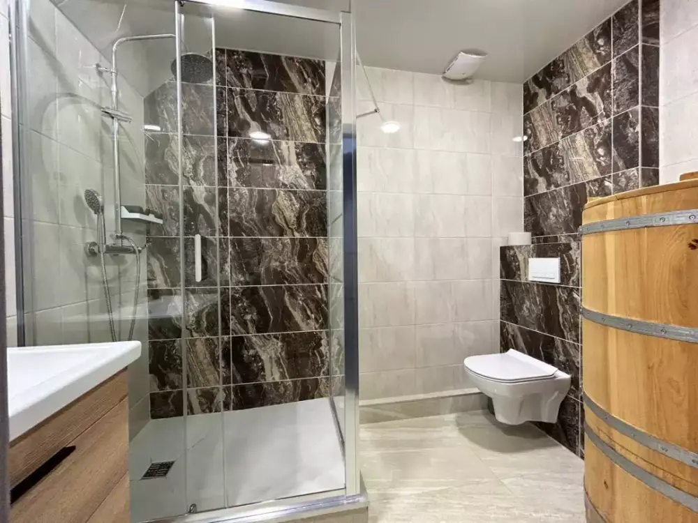 На территории есть большая уютная банька с купелью. Визит можно забронировать за отдельную плату.