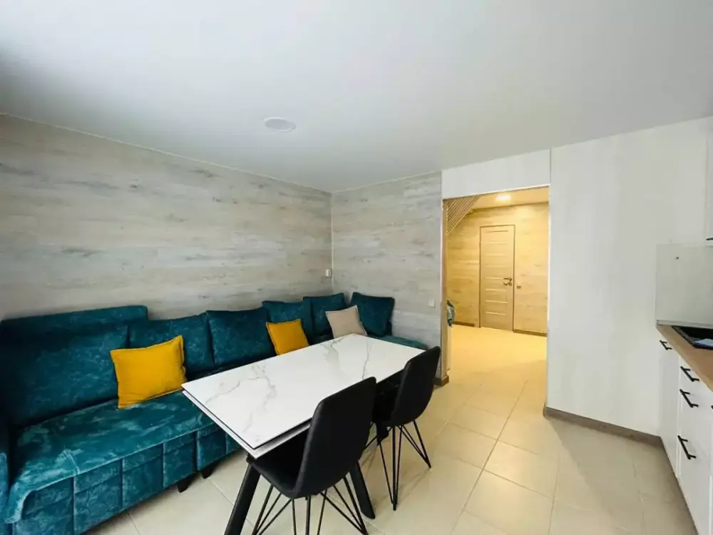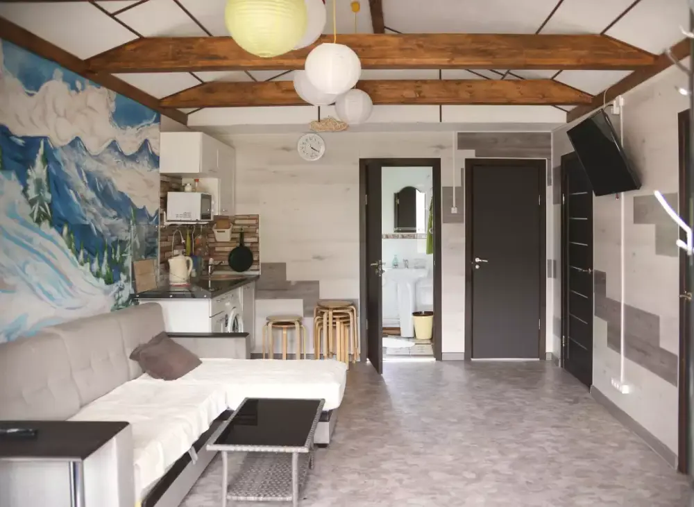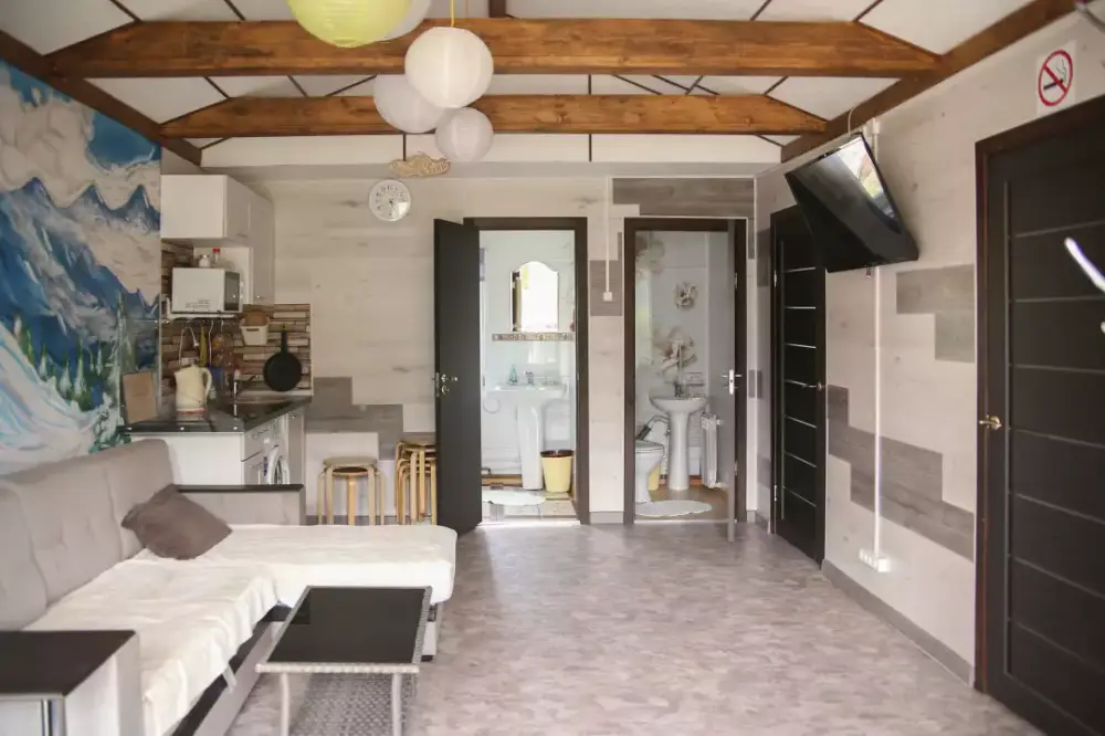 1 этаж: Большая гостиная комната совмещенная с кухней. Где есть большой раскладной диван, телевизор. Кухонная зона оснащена всем необходимым для комфортного проживания. Санузел, душ.
