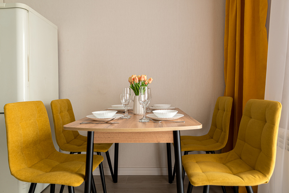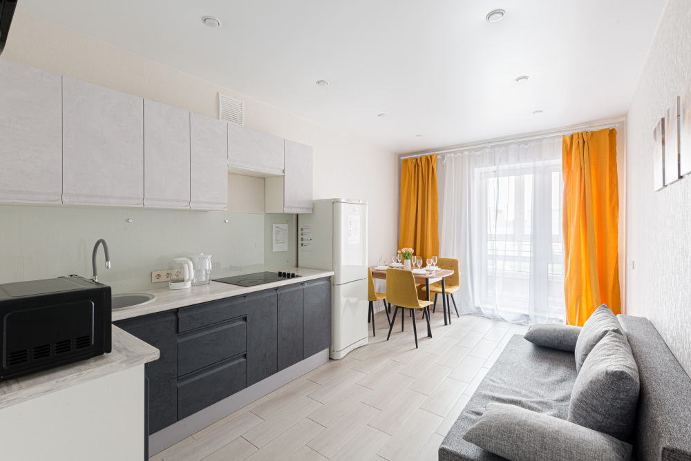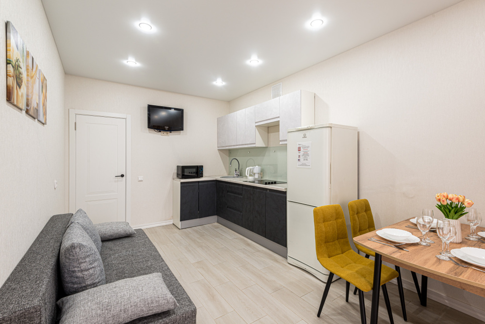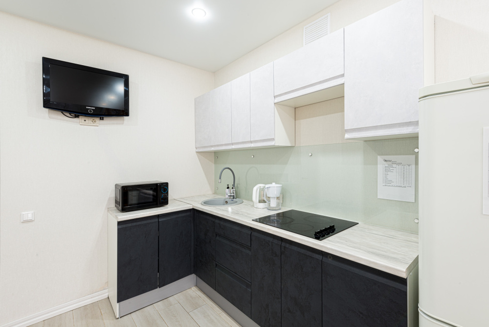 – Полностью оборудованная кухня (холодильник, электрическая варочная панель, микроволновая печь, электрический чайник, фильтр для питьевой воды)