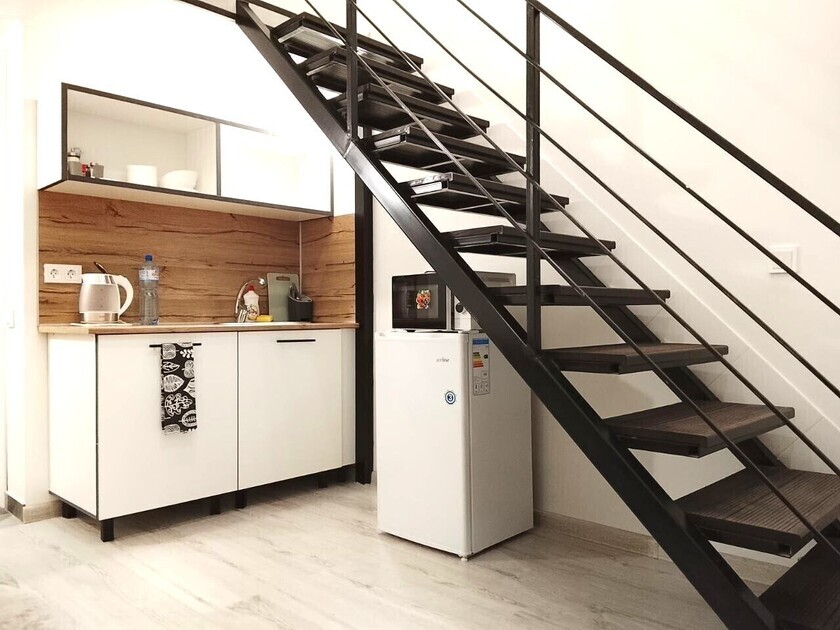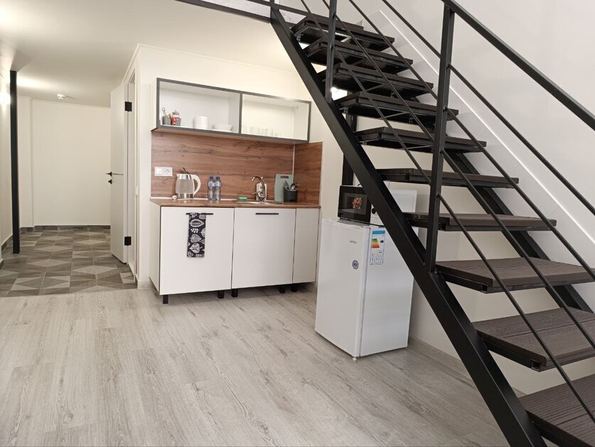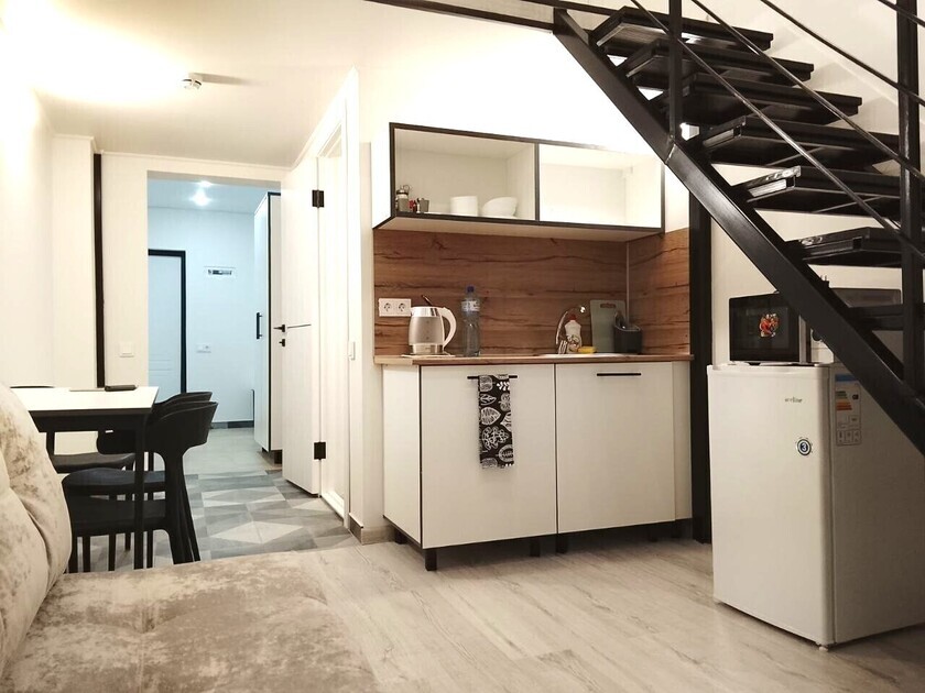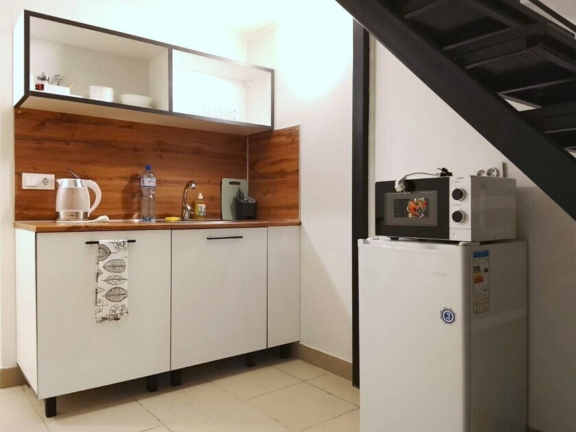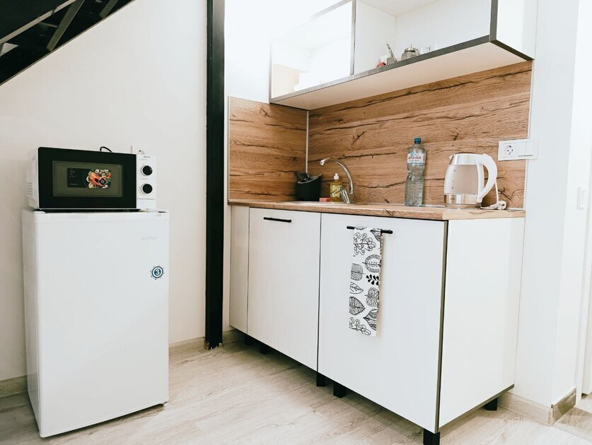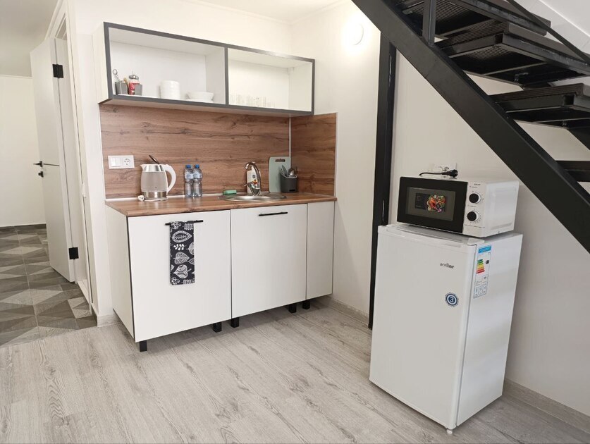 - в номерах: мини-кухня, санузел с душевой, телевизор, кондиционер, холодильник, микроволновка, чайник, фен, посуда и все необходимое;