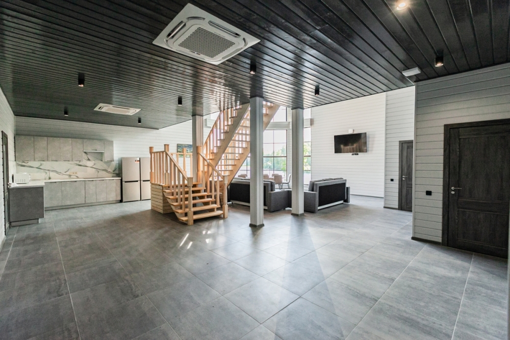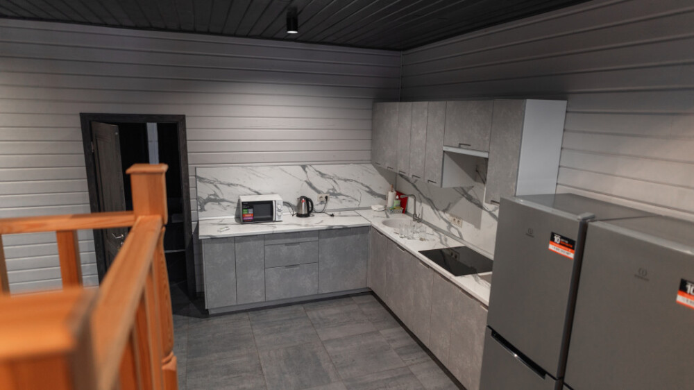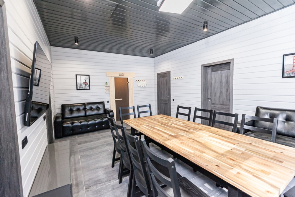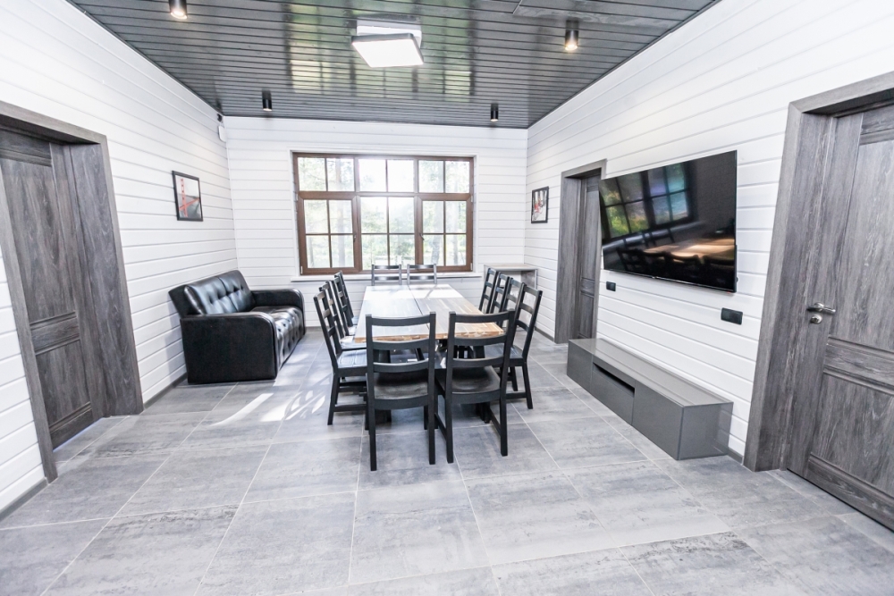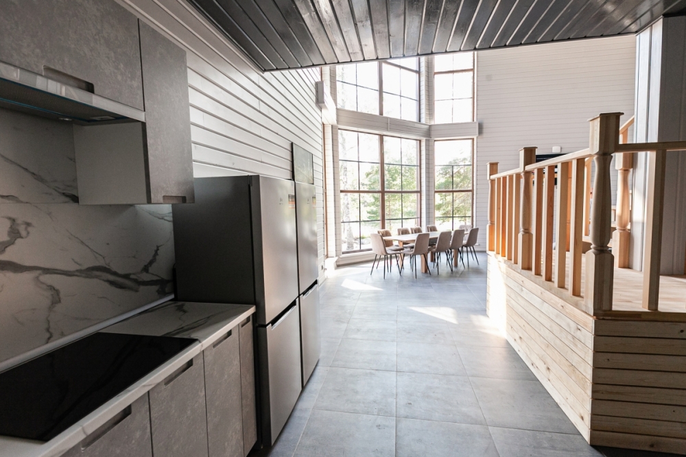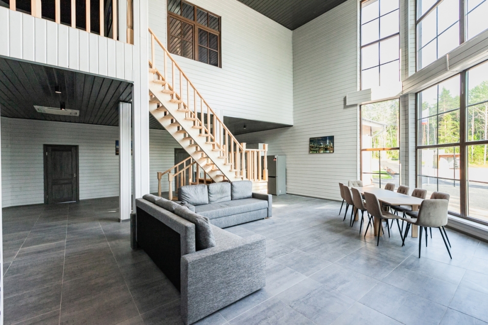 Просторный дом для большой компании. Огромное панорамное окно с потрясающим видом на озеро. Оборудованная кухня с 4 комфорочной плитой, двумя посудомоечными машинами, микроволновками, холодильниками и посудой. 10 комнат, из которых 8 оборудованы санузлами с душевыми кабинками. Две двуспальные кровати и шестнадцать односпальных. Спутниковое ТВ, Wi-Fi.