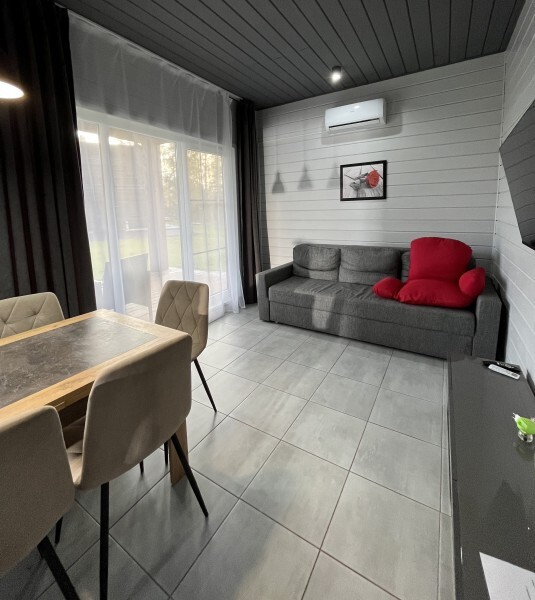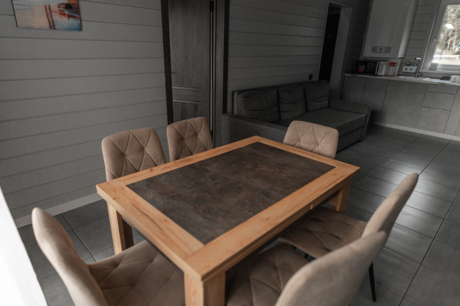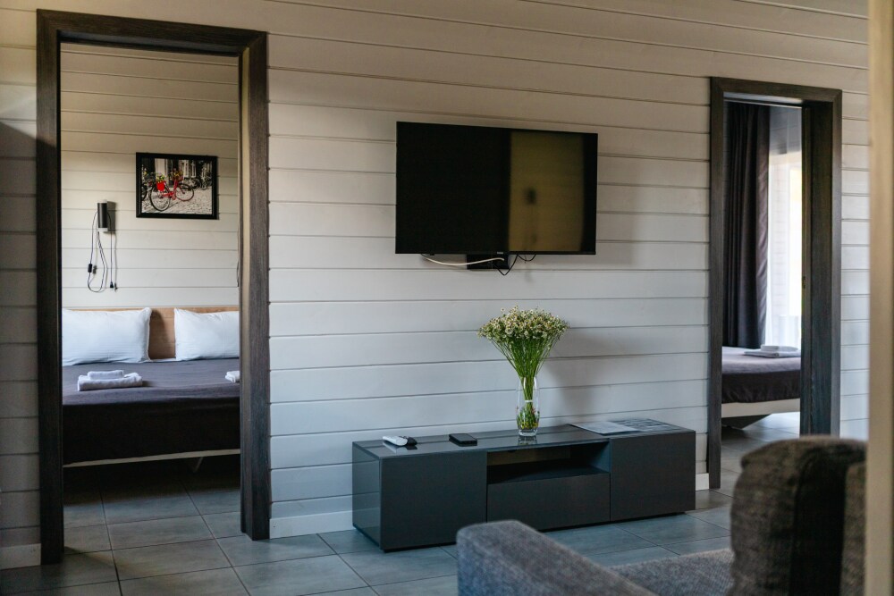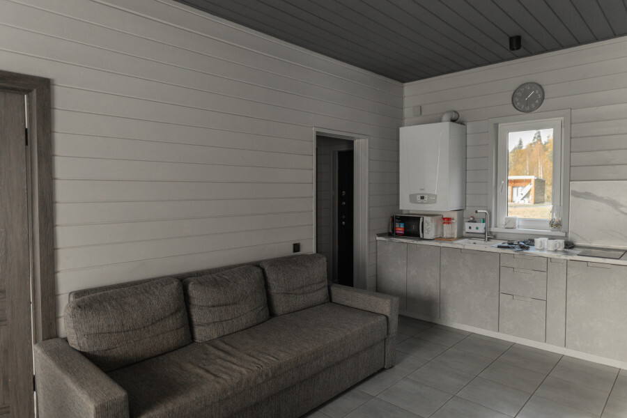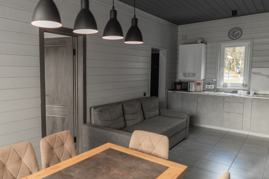Уютный домик из трёх комнат, с гостиной и террасой с видом на озеро. В доме имеется оборудованная кухня с посудой, микроволновка, чайник. Обеденный стол на 6 персон. Спутниковое ТВ и Wi-Fi. три двуспальные кровати, и раскладной диванчик, с возможностью организации ещё двух дополнительных спальных мест. Два санузла. Кондиционер, или тёплый пол, обеспечат комфортную температуру в любое время года.