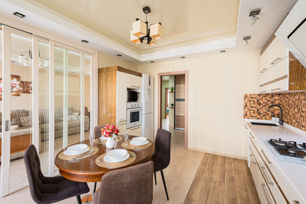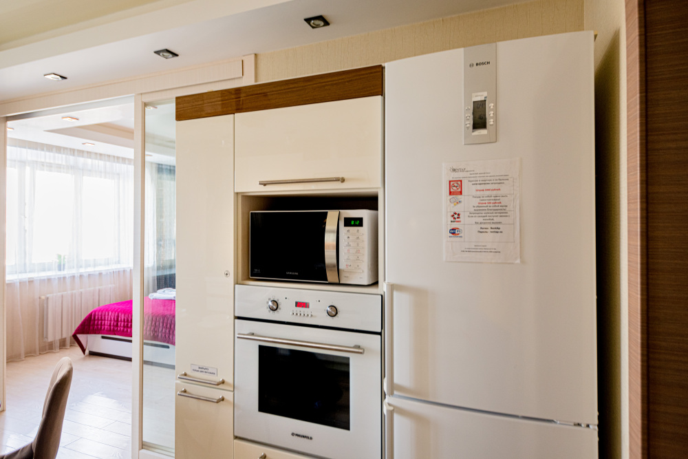 – Полностью оборудованная кухня (холодильник, газовая варочная панель, духовой шкаф, вытяжка, микроволновая печь, электрический чайник, фильтр для питьевой воды)