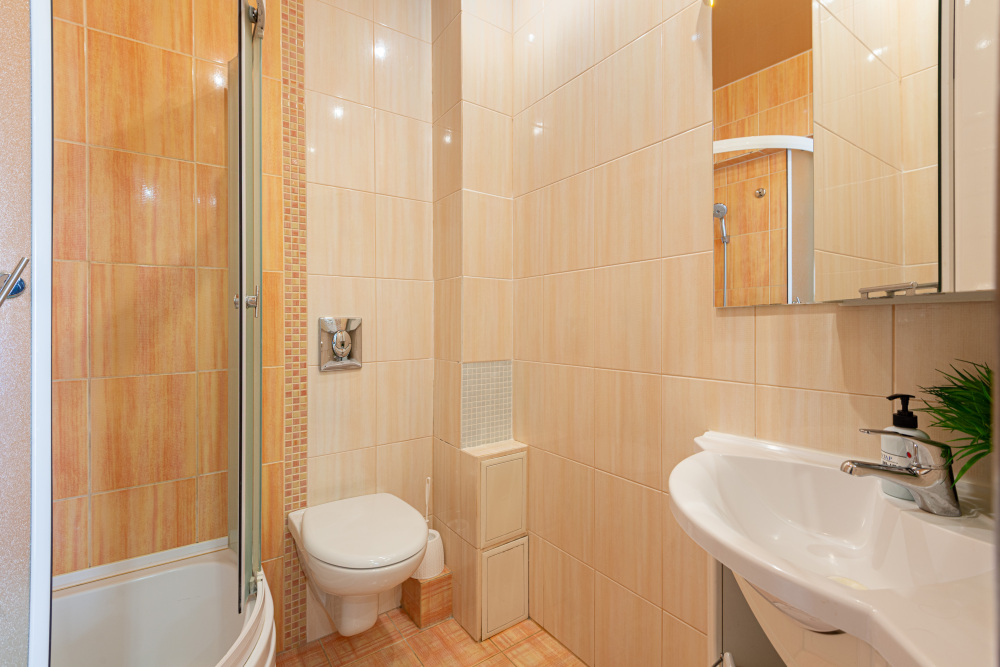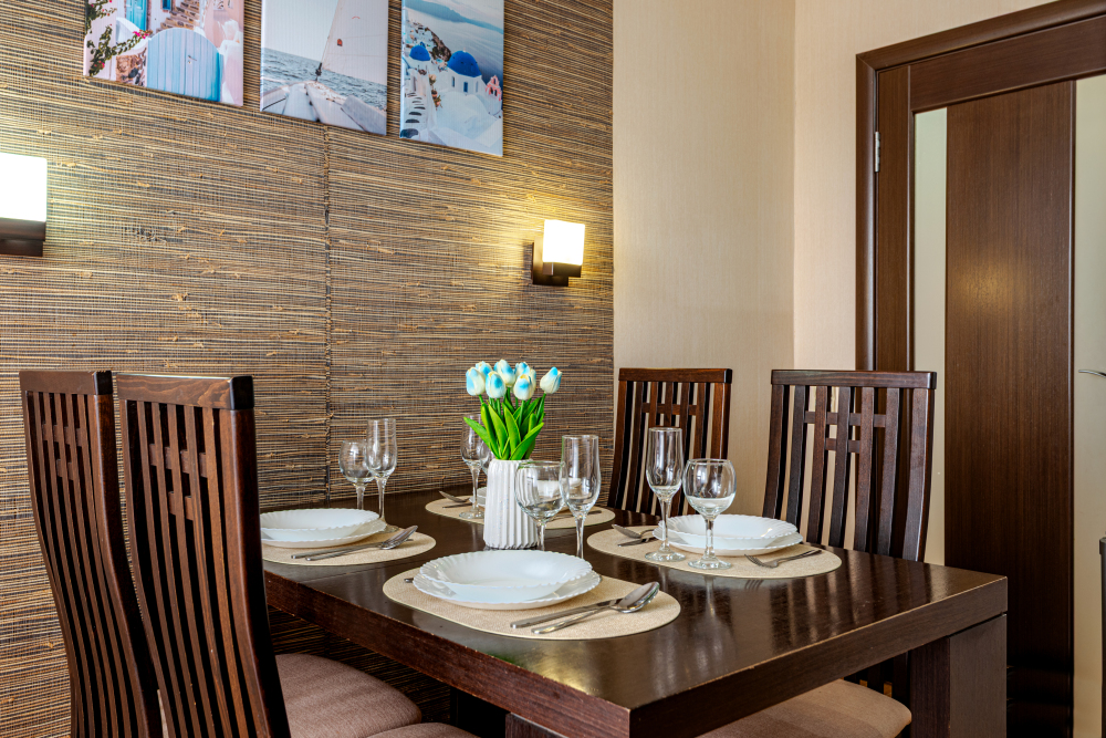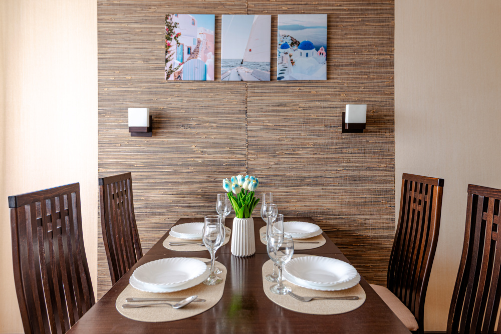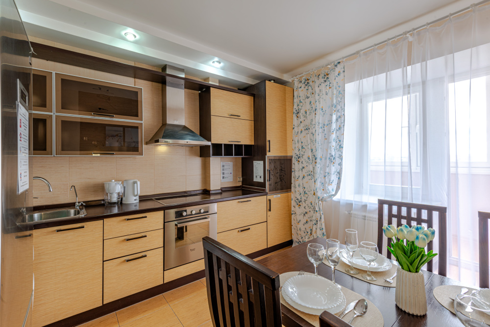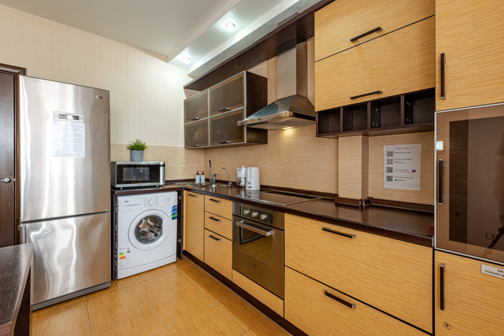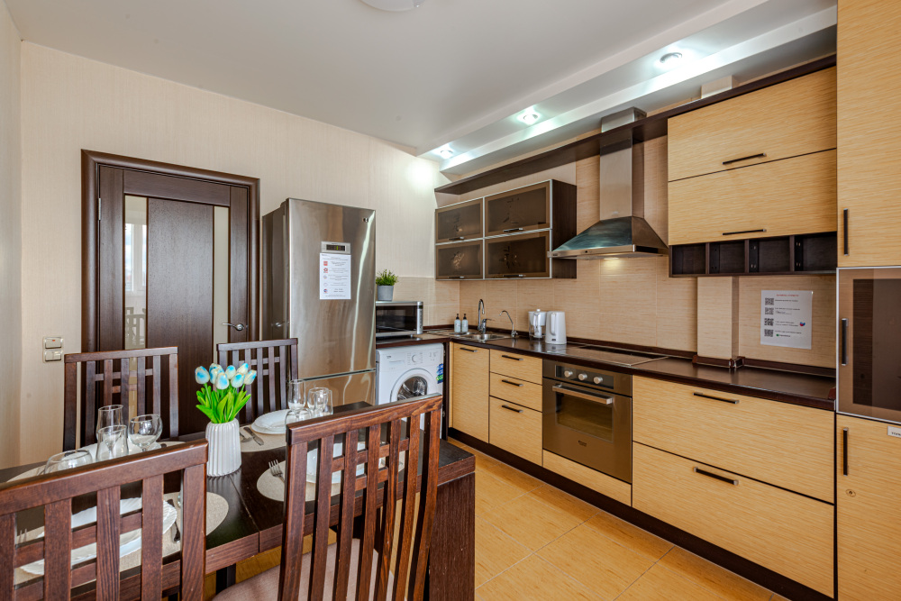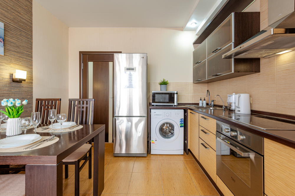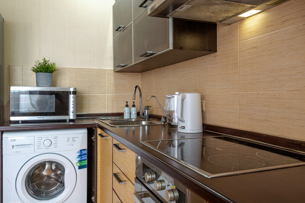 – Полностью оборудованная кухня (холодильник, электрическая варочная панель, духовой шкаф, вытяжка, микроволновая печь, электрический чайник, фильтр для питьевой воды)