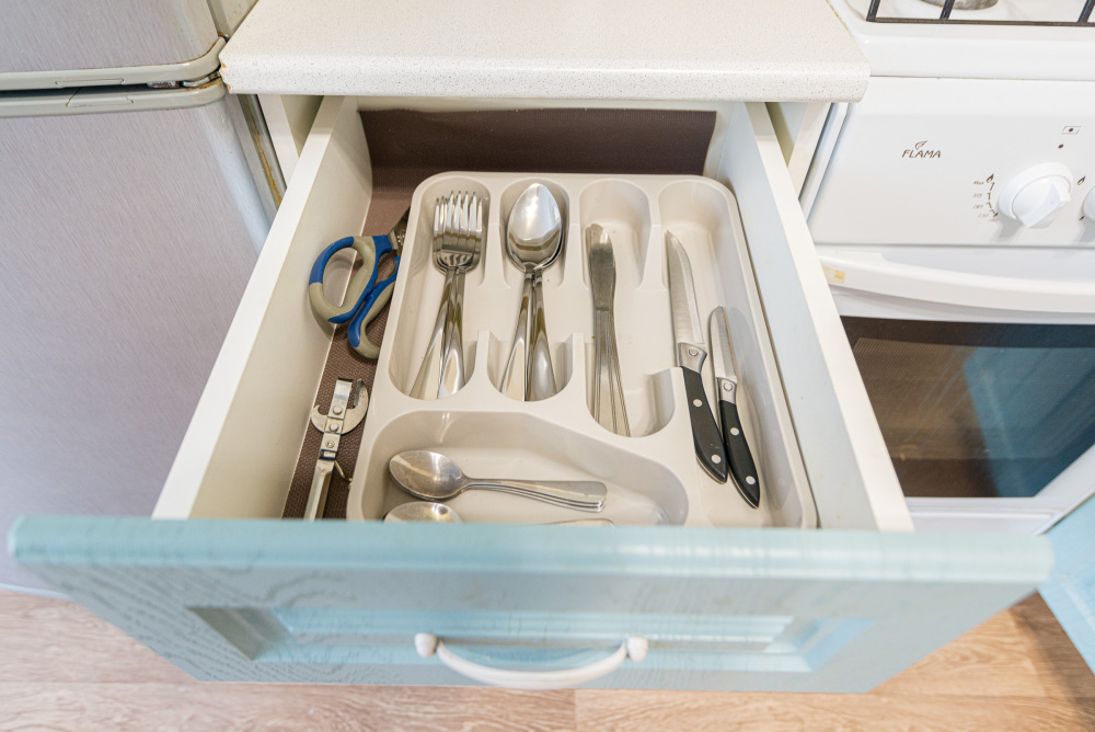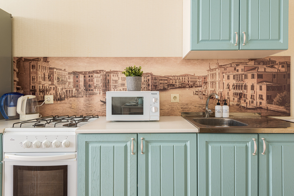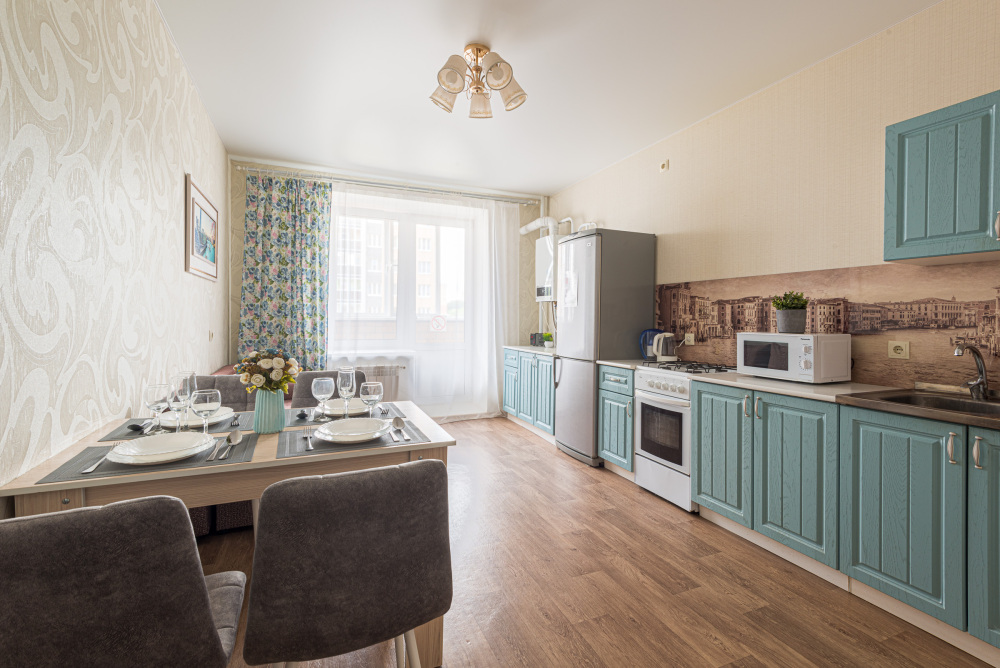 – Полностью оборудованная кухня (холодильник, газовая плита с духовкой, вытяжка, микроволновая печь, электрический чайник, фильтр для питьевой воды)