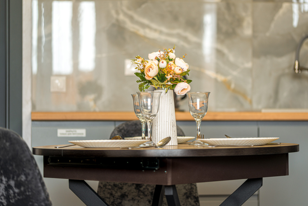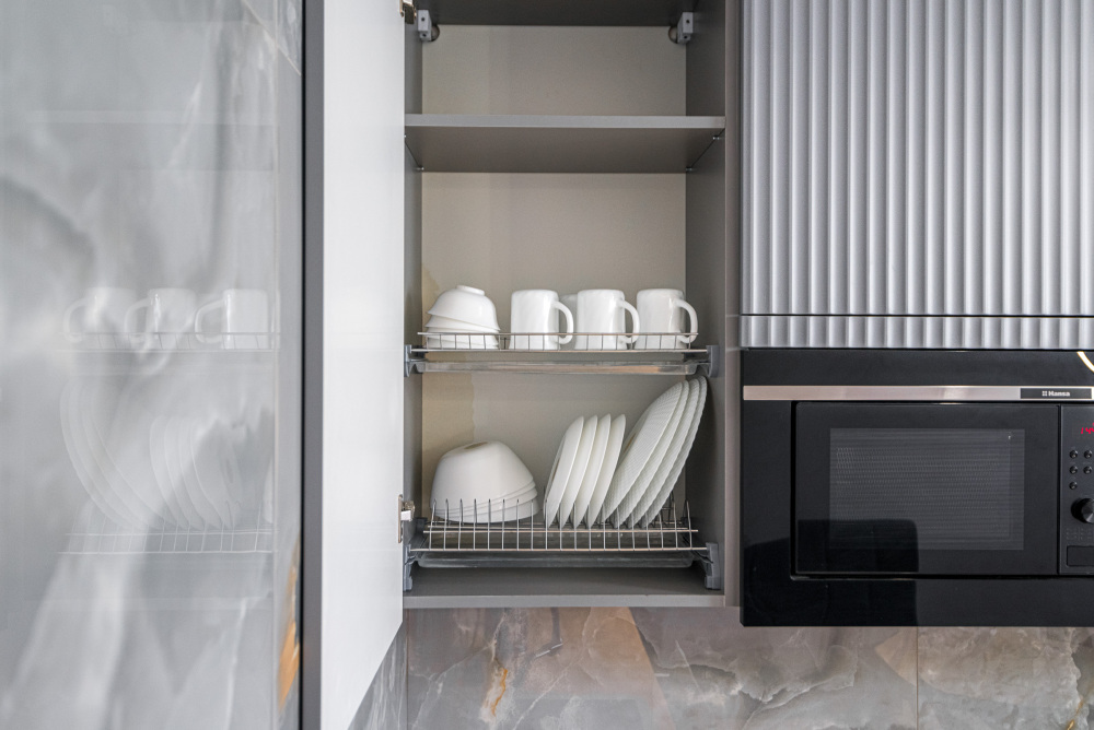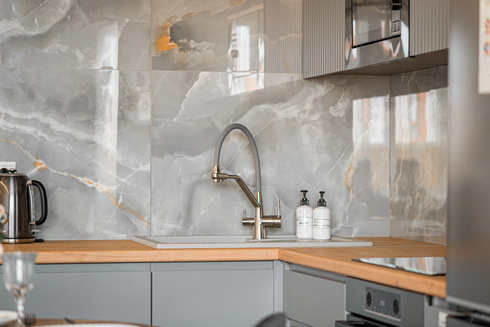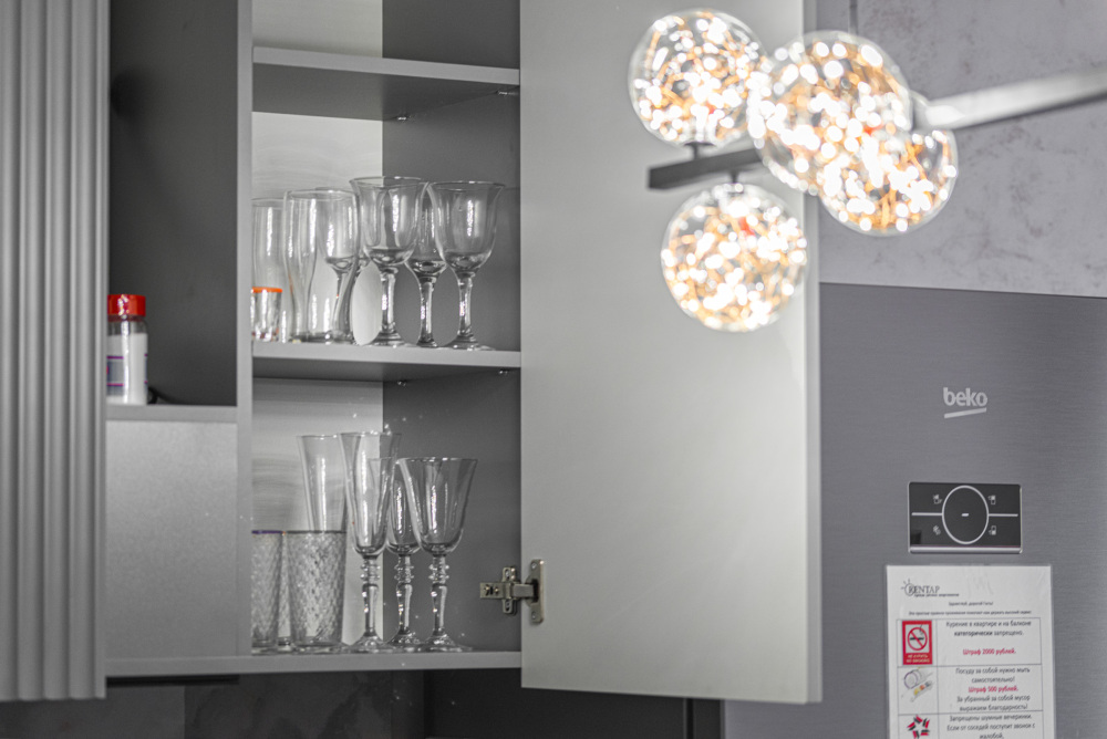 – Полностью оборудованная кухня (холодильник, электрическая варочная панель, духовой шкаф, вытяжка, микроволновая печь, электрический чайник, фильтр для питьевой воды)