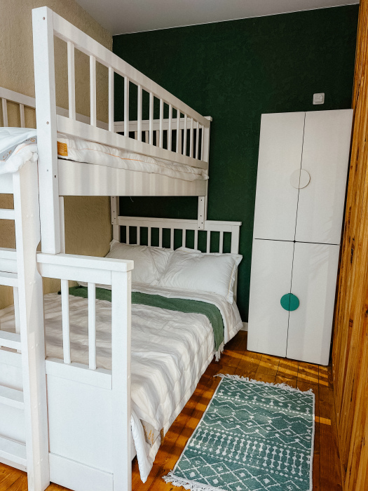 5 спальных мест + 2 доп. (двуспальная кровать, двухъярусная детская кровать (1 спальное место наверху и 2 внизу, диван Memory Foam).