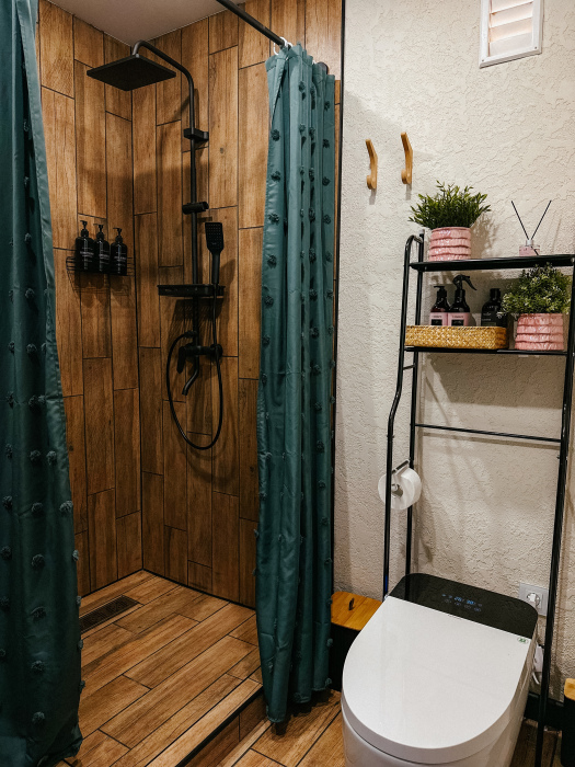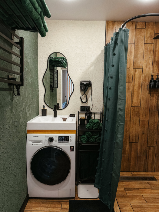 Санузел: душ, умный унитаз, стирально-сушильная машина.