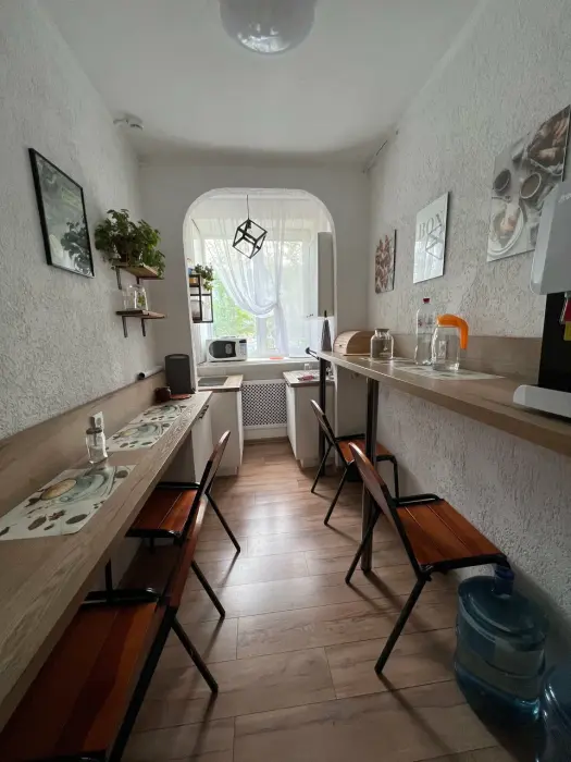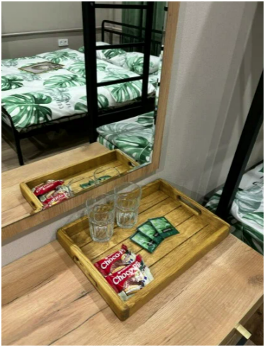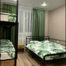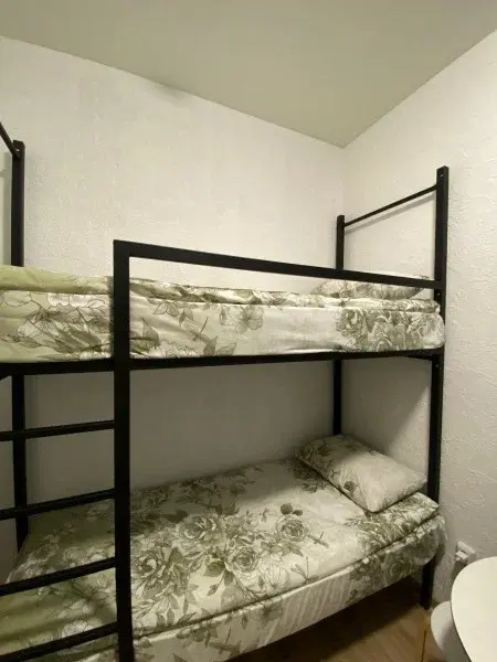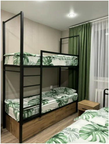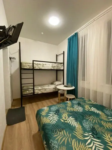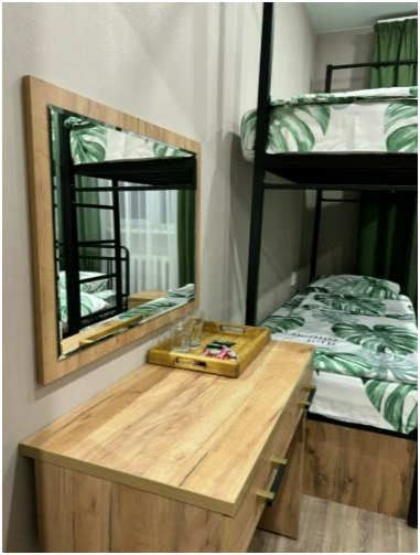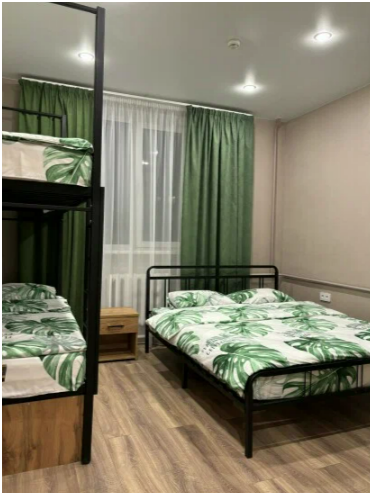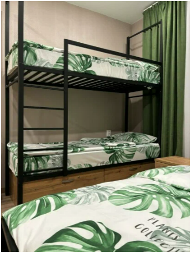 Семейный номер категории Комфорт. Номер оснащен одной двуспальной кроватью и одной двухъярусной в стиле Лофт. В номере своя душевая и санузел, фен. Наличие ТВ, бесплатный Wi-Fi на территории отеля, общая кухня в шаговой доступности. Кухня оснащена всем необходимым для приготовления пищи.