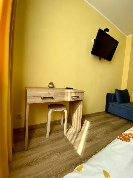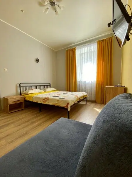 Двухместный номер категории Комфорт. Номер оснащен одной двуспальной кроватью и раскладным диванчиком. В номере своя душевая и санузел.