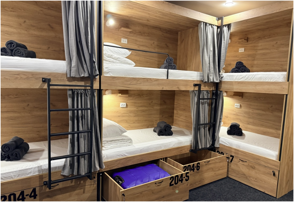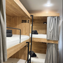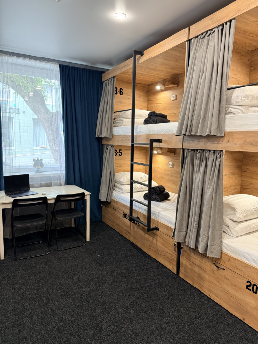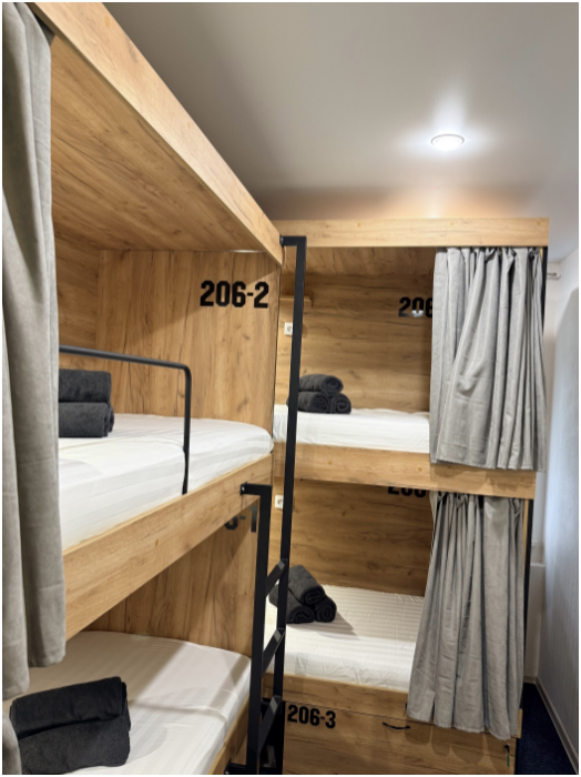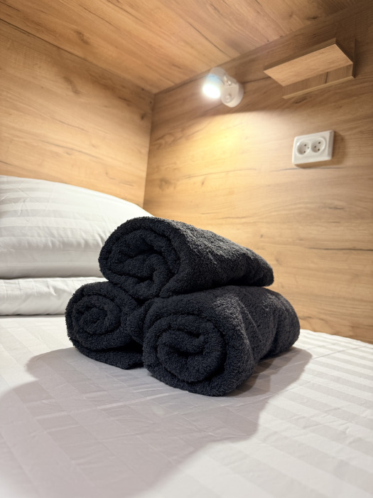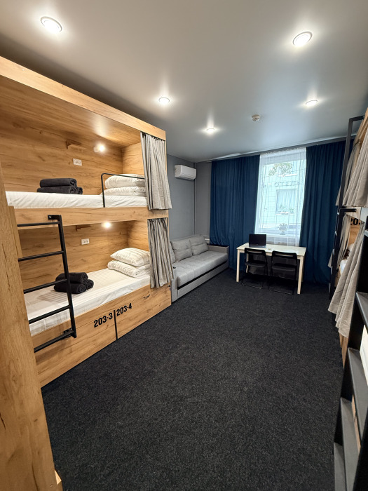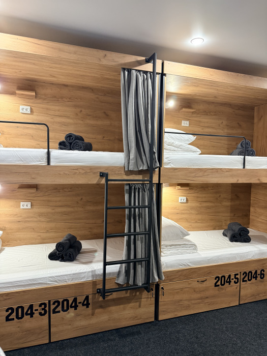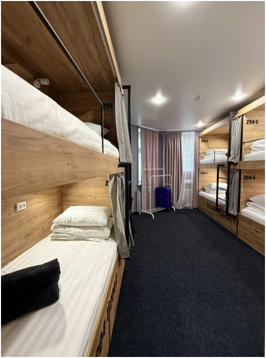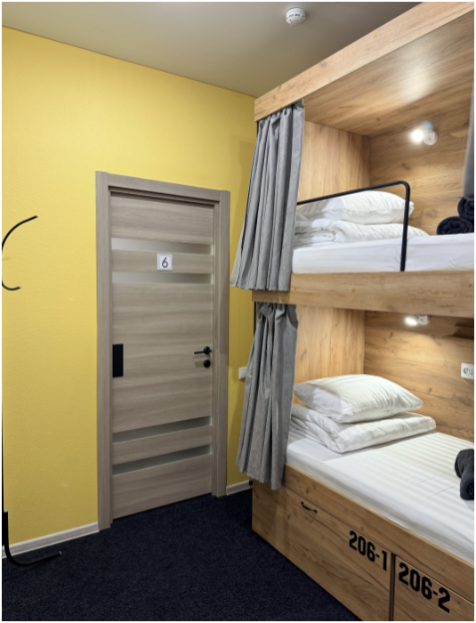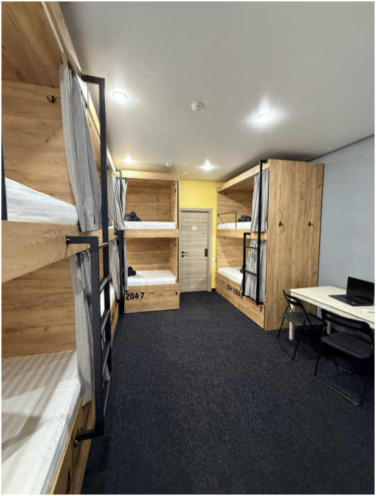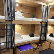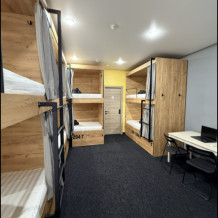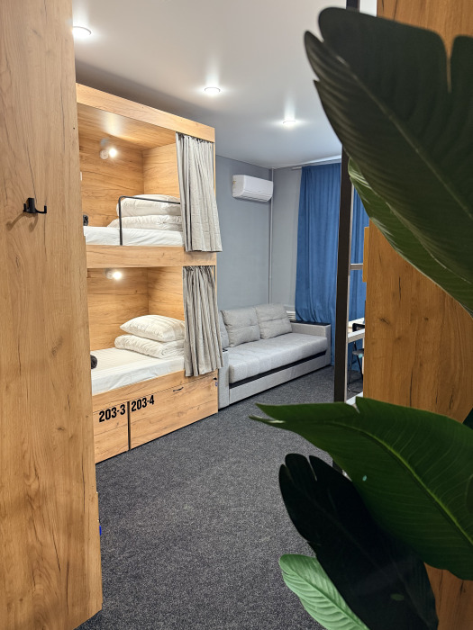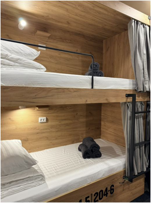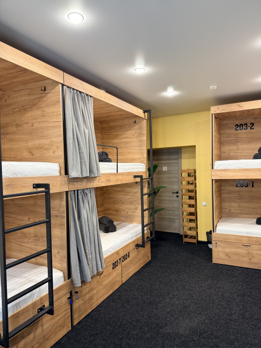 5 Двухъярусных кроватей со шторками. Индивидуальные выкатные шкафчики. Вешалка. Зеркало. Прикроватные светильники. Кондиционер. Ламинат. Индивидуальные полотенца.