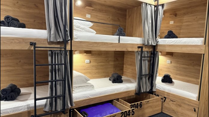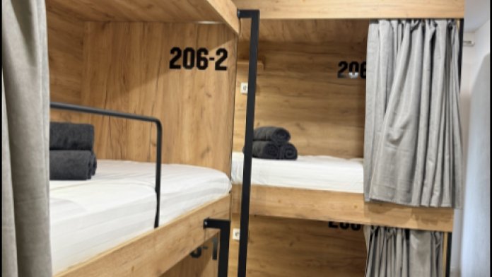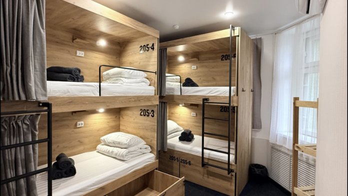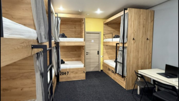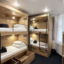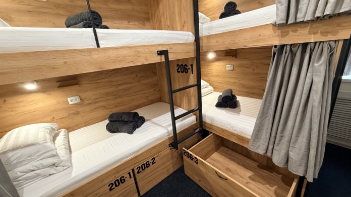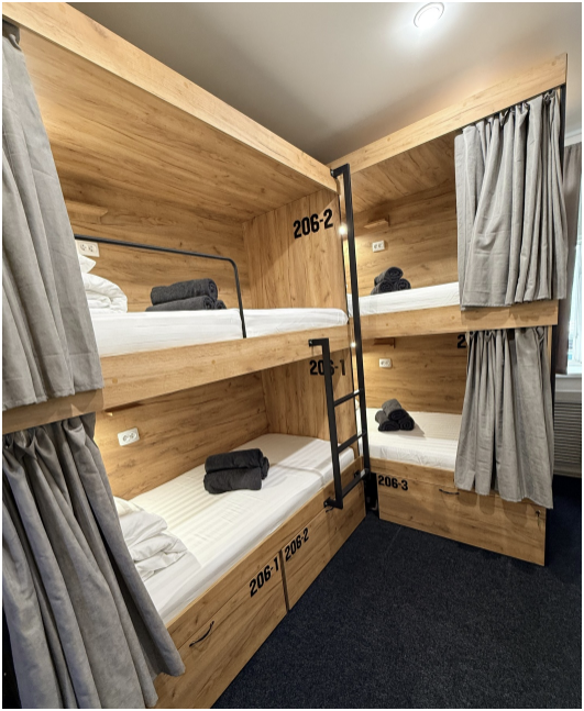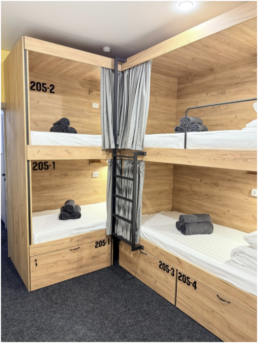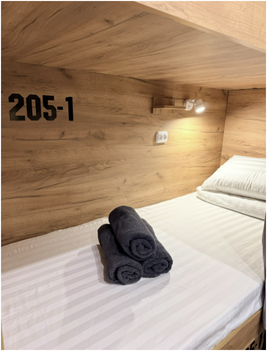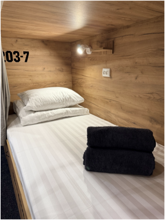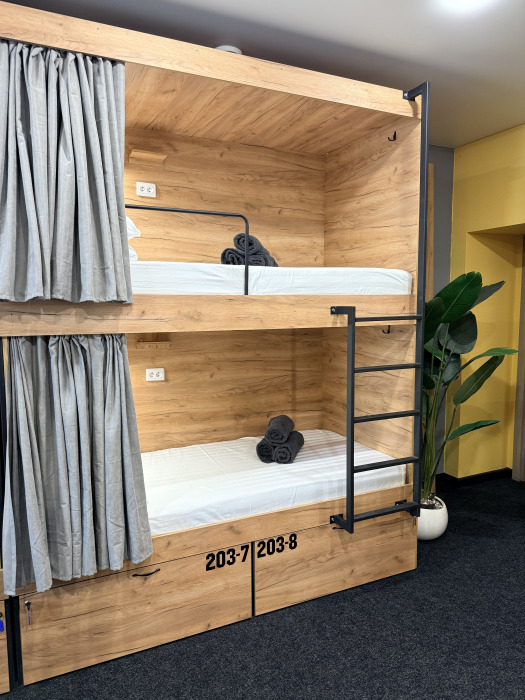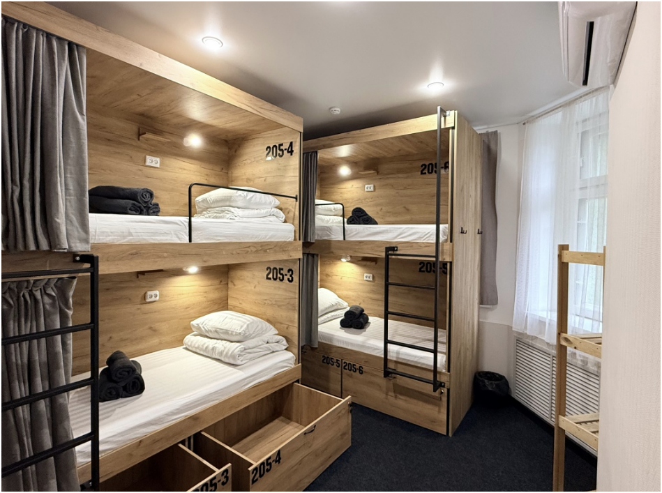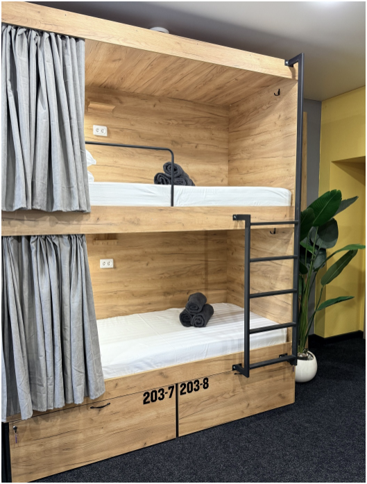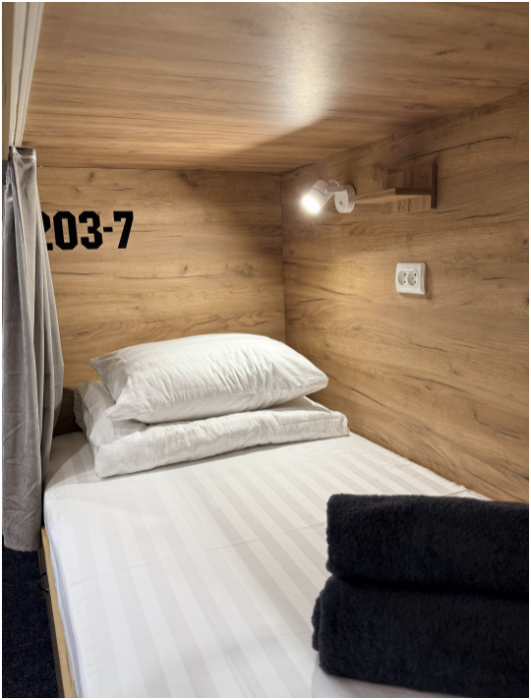 5 Двухъярусных кроватей со шторками. Индивидуальные выкатные шкафчики. Вешалка. Зеркало. Прикроватные светильники. Кондиционер. Ламинат. Индивидуальные полотенца.